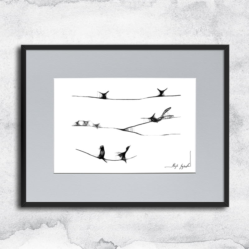 Gerahmte Grafik in Mischtechnik (Giclée + Isographie Zeichnung) auf weißer, matter, leicht strukturierter Oberfläche, 160-250g Canson Grafikpapier. Die einzigartige Linie sieht sehr beeindruckend aus und Schwarz-Weiß-Grafiken passen perfekt in leere Wände moderner, minimalistischer oder Loft-Interieurs.