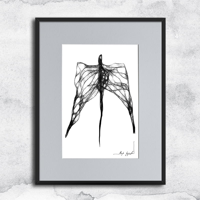 Gerahmte Grafik in Mischtechnik (Giclée + Isographie Zeichnung) auf weißer, matter, leicht strukturierter Oberfläche, 160-250g Canson Grafikpapier. Die einzigartige Linie sieht sehr beeindruckend aus und Schwarz-Weiß-Grafiken passen perfekt in leere Wände moderner, minimalistischer oder Loft-Interieurs.