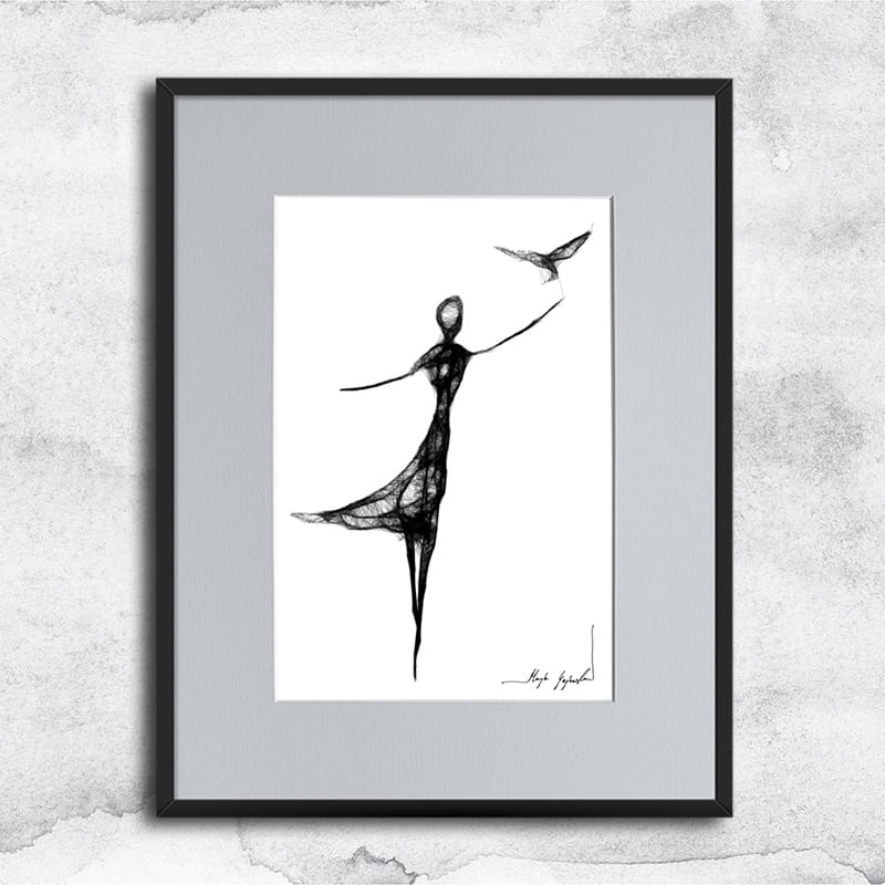 Gerahmte Grafik in Mischtechnik (Giclée + Isographie Zeichnung) auf weißer, matter, leicht strukturierter Oberfläche, 160-250g Canson Grafikpapier. Die einzigartige Linie sieht sehr beeindruckend aus und Schwarz-Weiß-Grafiken passen perfekt in leere Wände moderner, minimalistischer oder Loft-Interieurs.