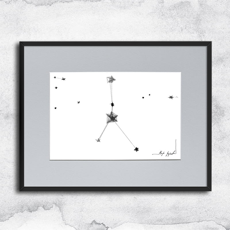 Gerahmte Grafik in Mischtechnik (Giclée + Isographie Zeichnung) auf weißer, matter, leicht strukturierter Oberfläche, 250g Canson Grafikpapier. Die einzigartige Linie sieht sehr beeindruckend aus und Schwarz-Weiß-Grafiken passen perfekt in leere Wände moderner, minimalistischer oder Loft-Interieurs.