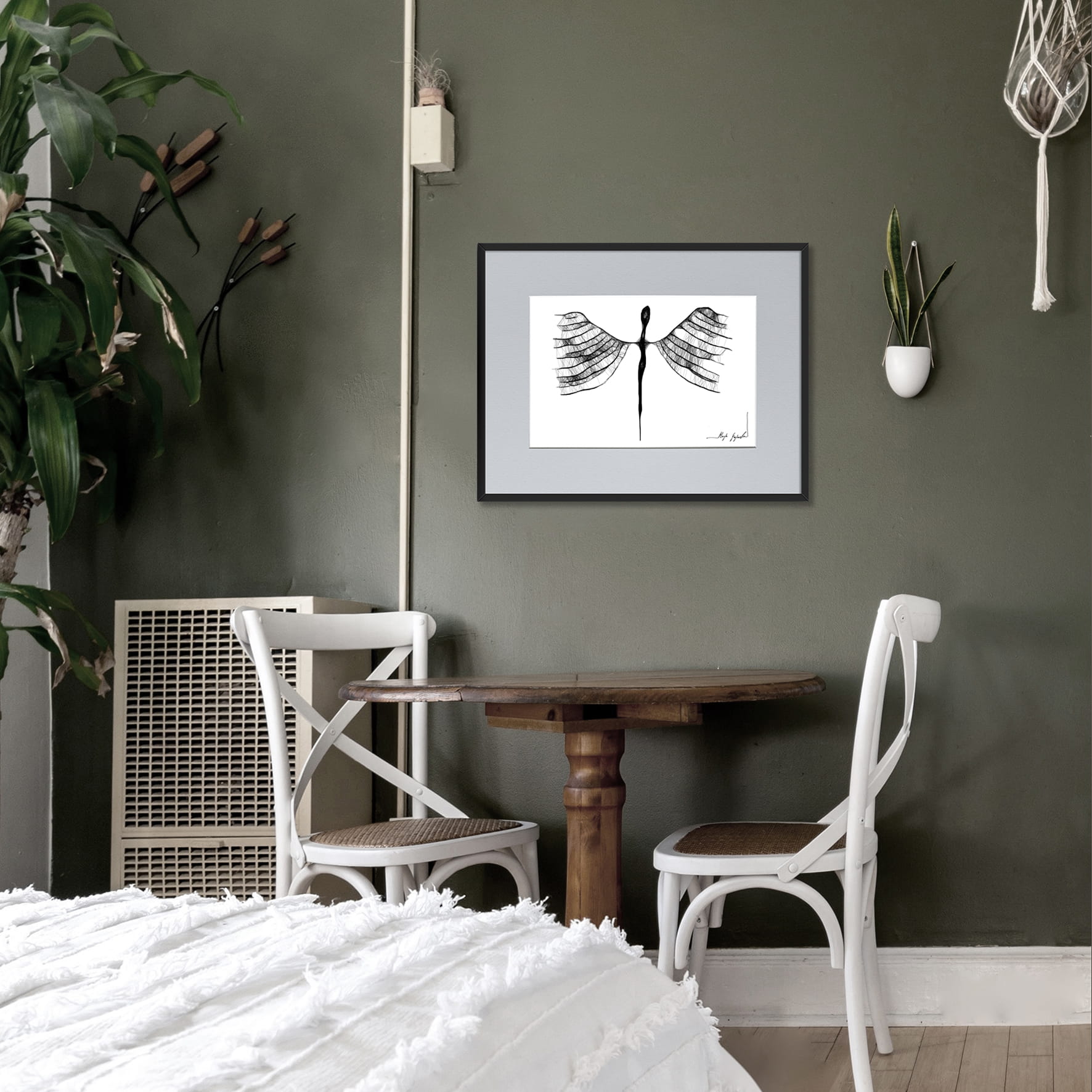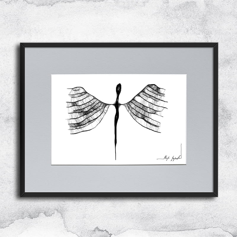 Gerahmte Grafik in Mischtechnik (Giclée + Isographie Zeichnung) auf weißer, matter, leicht strukturierter Oberfläche, 160-250g Canson Grafikpapier. Die einzigartige Linie sieht sehr beeindruckend aus und Schwarz-Weiß-Grafiken passen perfekt in leere Wände moderner, minimalistischer oder Loft-Interieurs.