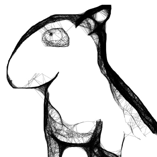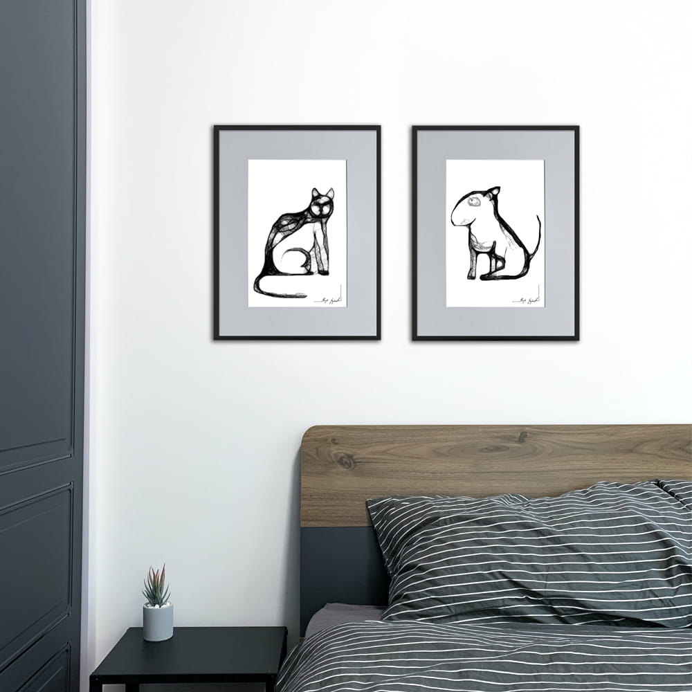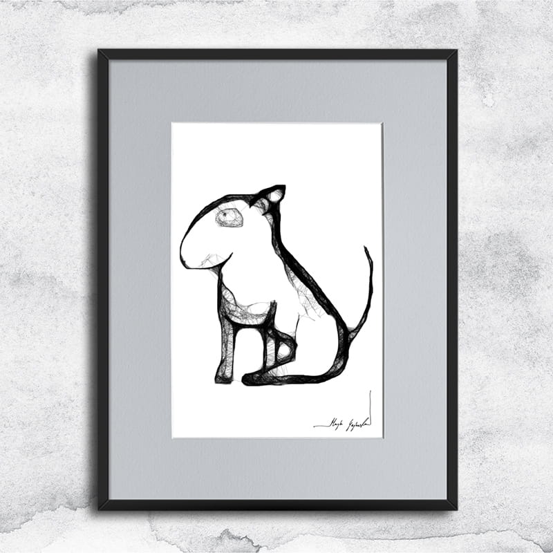 Inspiracją do powstania grafiki 109 była moja ukochana rasa i mój pies. Bulterier dzięki swej charakterystycznej budowie w łatwy sposób przyczynił się do powstania kolejnych grafik. Jest to ciekawa propozycja nie tylko dla psiarzy, również bardzo ładnie będzie prezentować się w pokoju dziecięcym i jako grafika na ścianę do sypialni lub gabinetu.