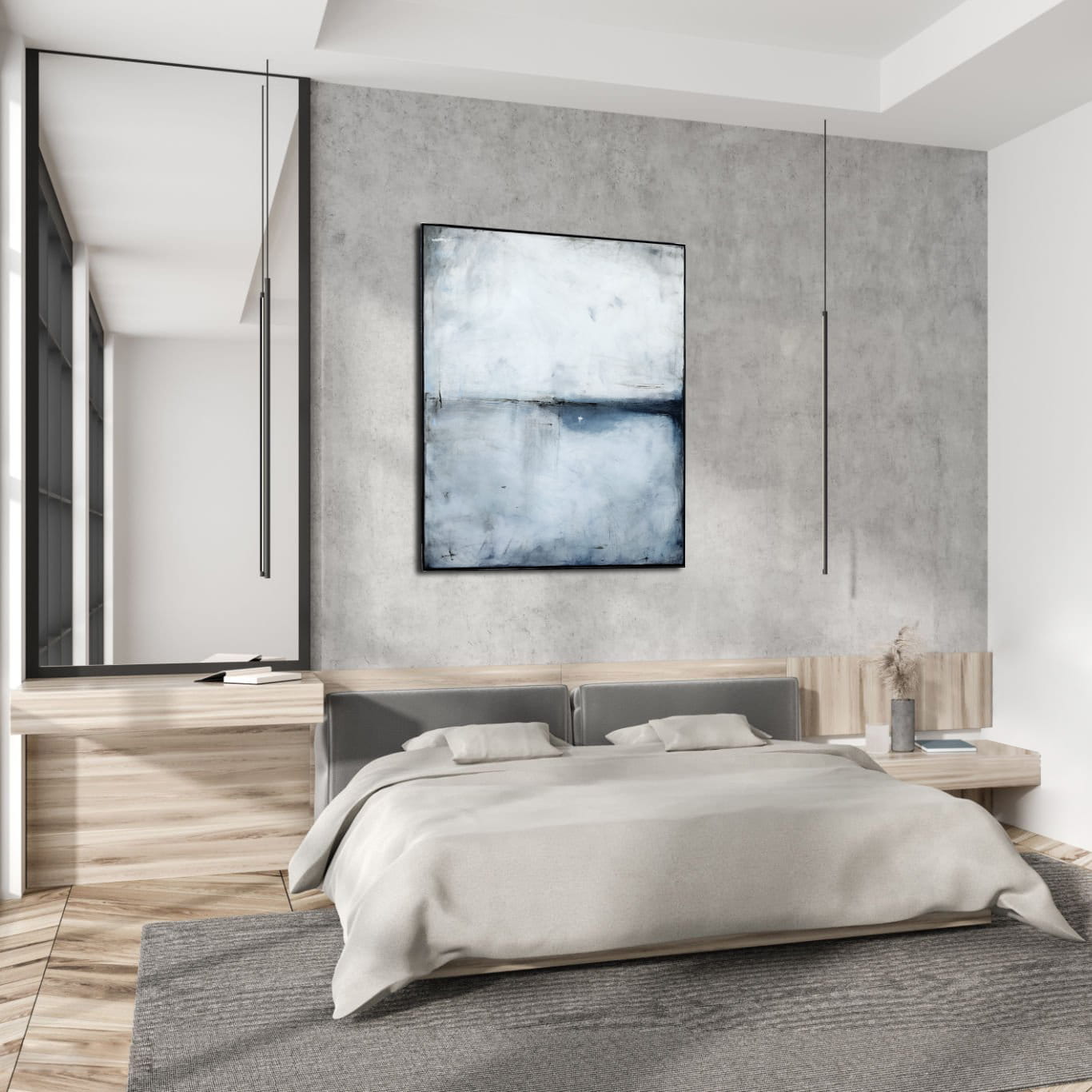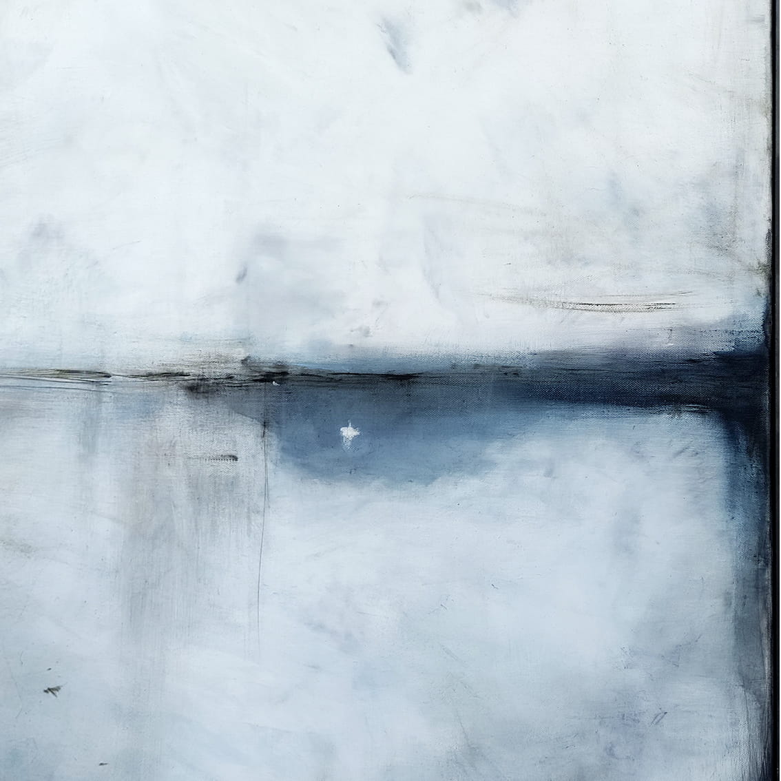 Biel z kobaltem I to minimalistyczny obraz oprawiony w metalową ramę. W obrazie dominuje gołębi błękit, szarość i akcenty granatu. Na pierwszy rzut oka obraz kojarzy się z abstrakcyjnym pejzażem. Jednakże jest to wysublimowana gra kolorów, płaszczyzn i linii niekiedy zanikających, innym razem stawiających granicę. Subtelna kolorystyka i zredukowana kompozycja pozwoli na wkomponowanie się obrazu olejnego we współczesne wnętrza z dodatkami szarości czy elementami drewna.