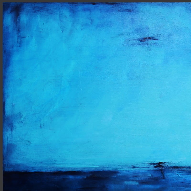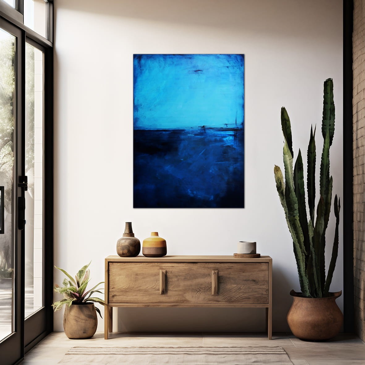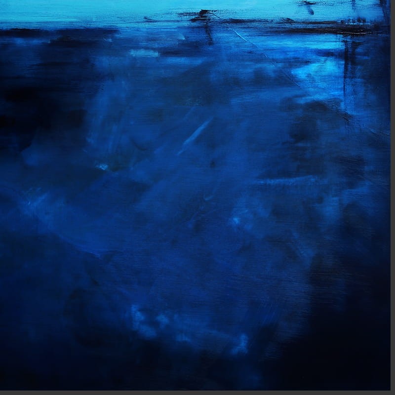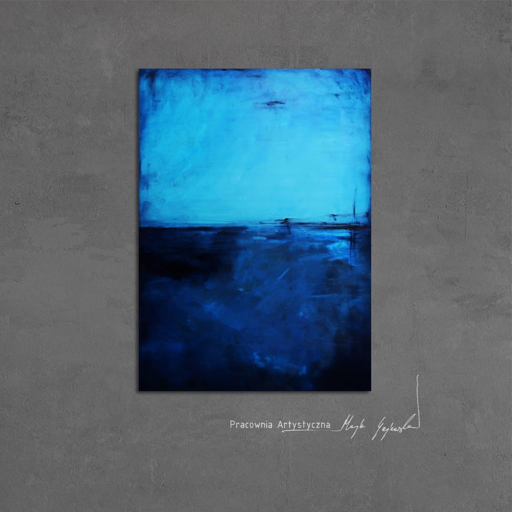 Nowoczesny obraz olejny, w którym wyraźnie dominują kolory błękitu i głębokiego niebieskiego przechodzącego w coraz mocniejsze tonacje, aż do ciemnego granatu. Obraz pasuje do salonu i sypialni wnosząc nienachalny koloryt do wnętrza.