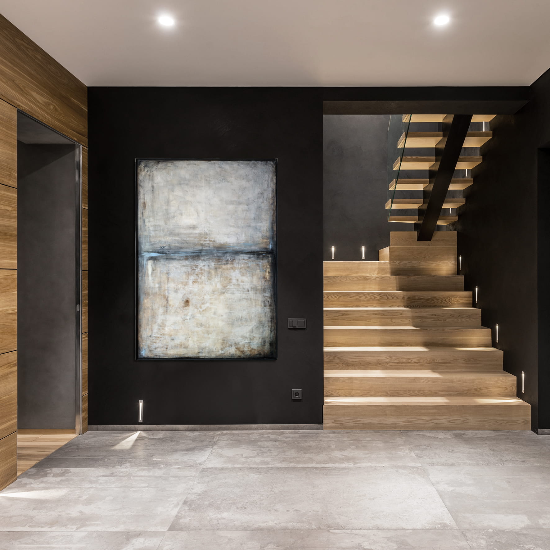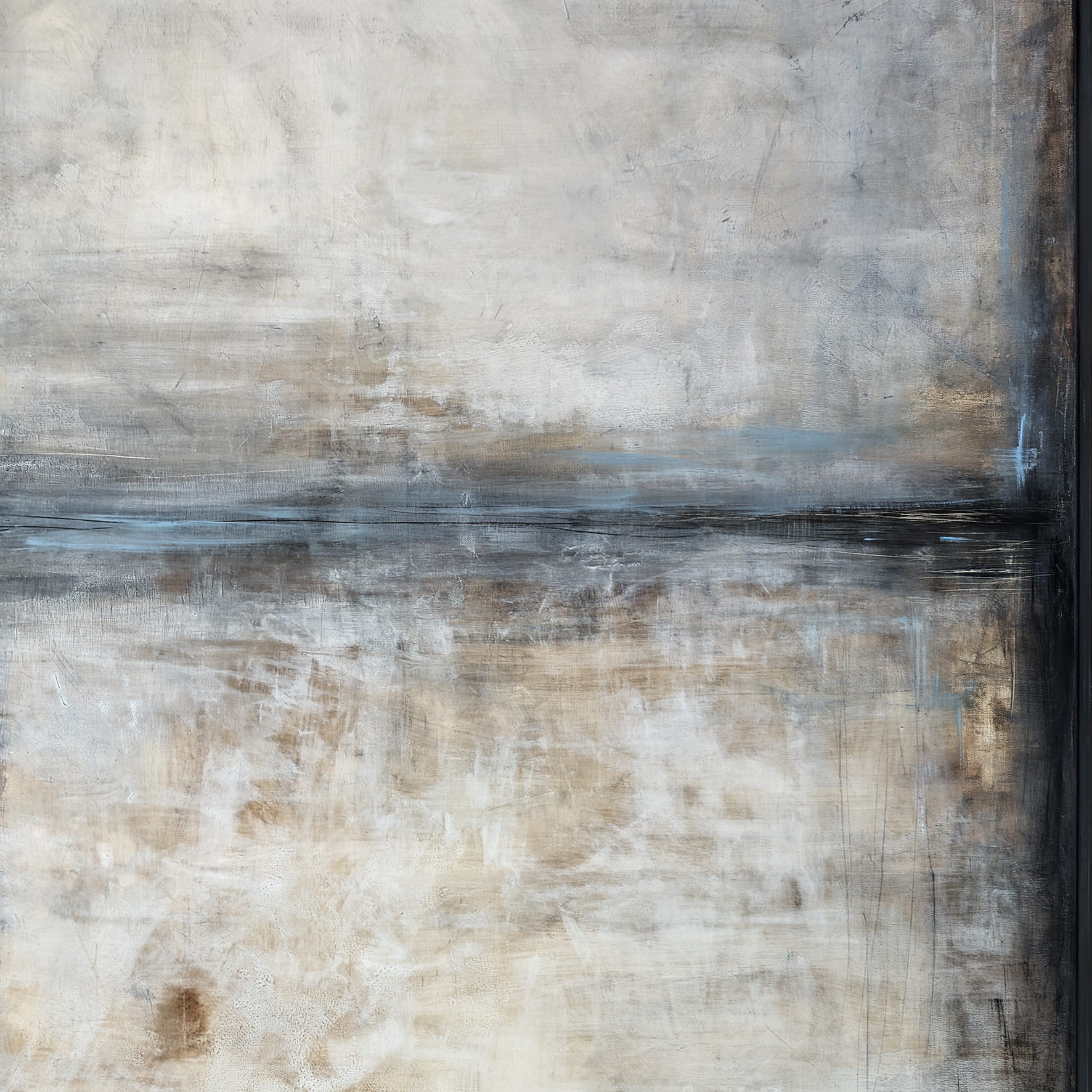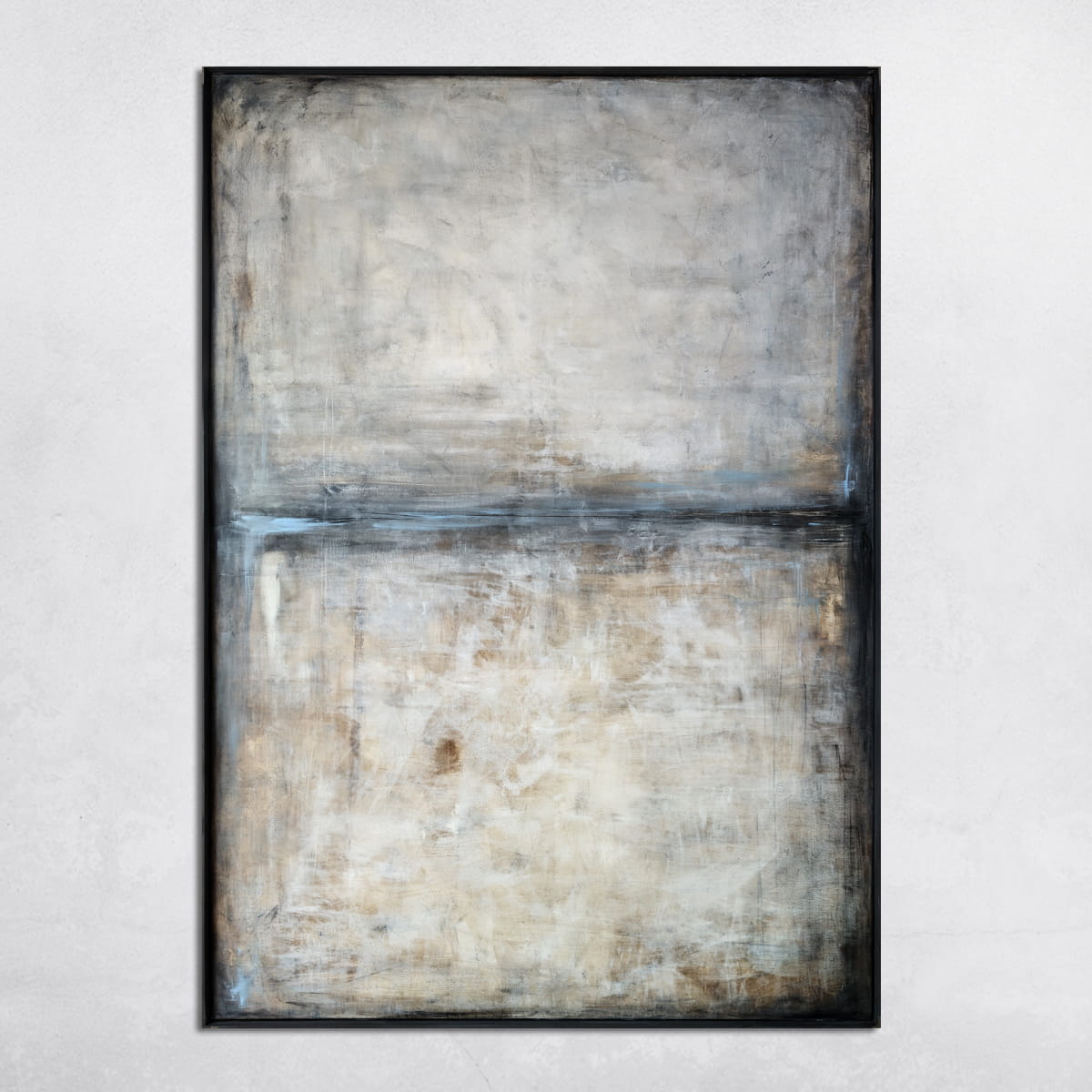 Harmonijny, minimalistyczny obraz w bieli, beżach, szarościach z akcentami brązu i błękitu. Subtelna kolorystyka i zredukowana kompozycja obrazu pozwoli idealnie wpasować się we współczesne wnętrza z dodatkami bieli, czy szarości. Każdy obraz na płótnie to poszukiwanie powiązań pomiędzy kolorami. Obrazy są nie tylko dekoracją salonu czy sypialni, są przede wszystkim odzwierciedleniem naszego stylu i atmosfery danego wnętrza.
