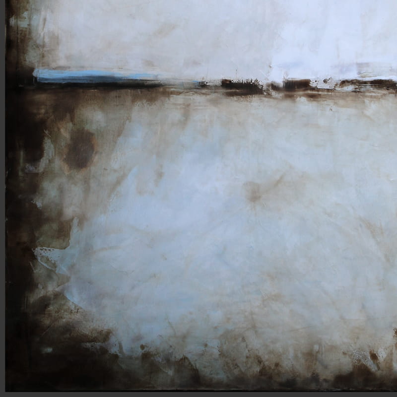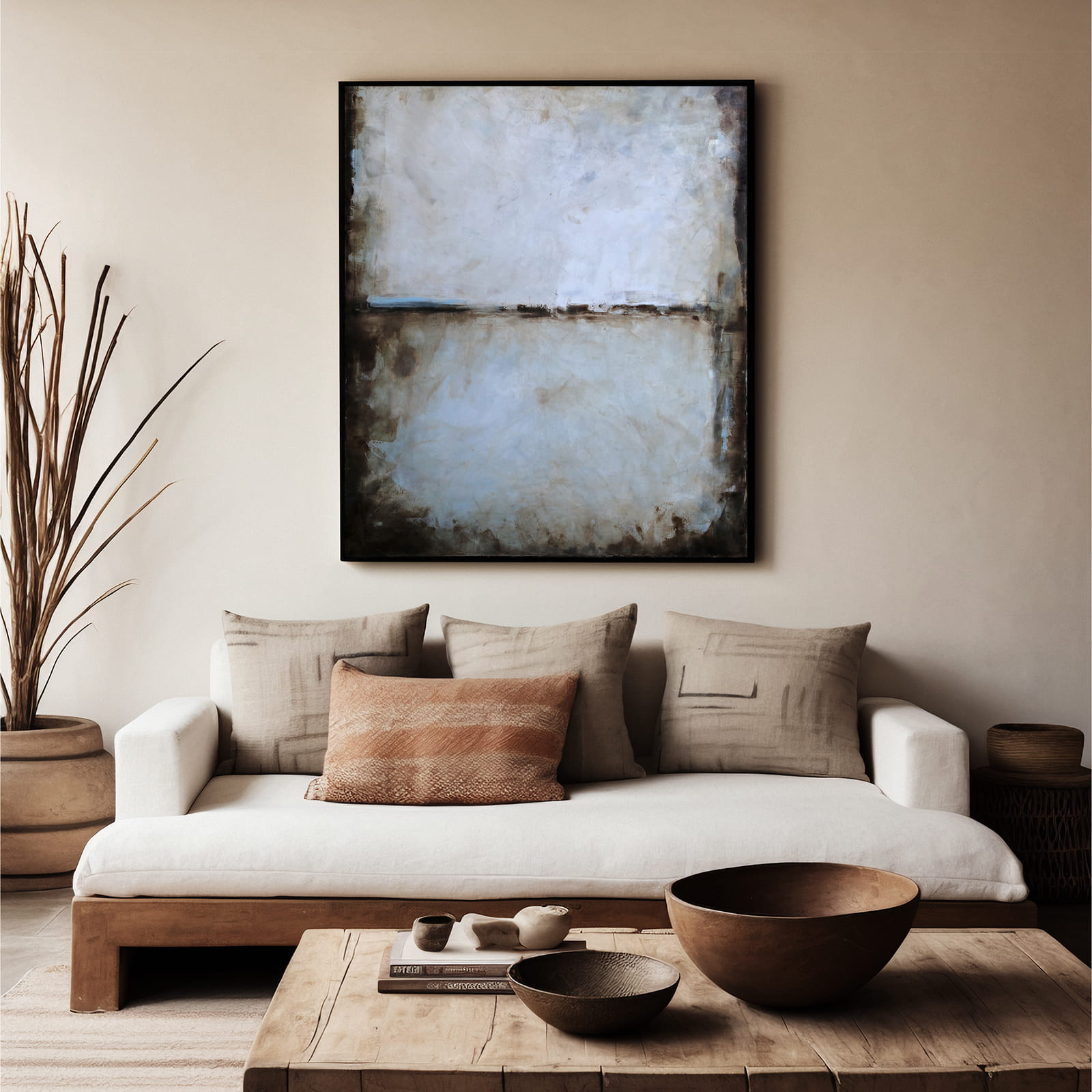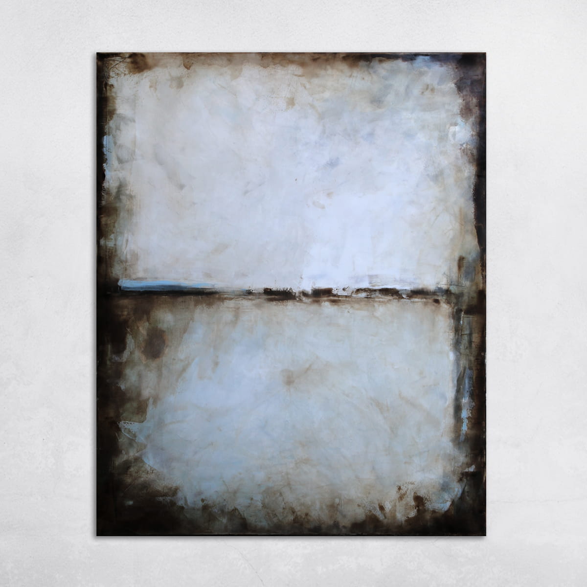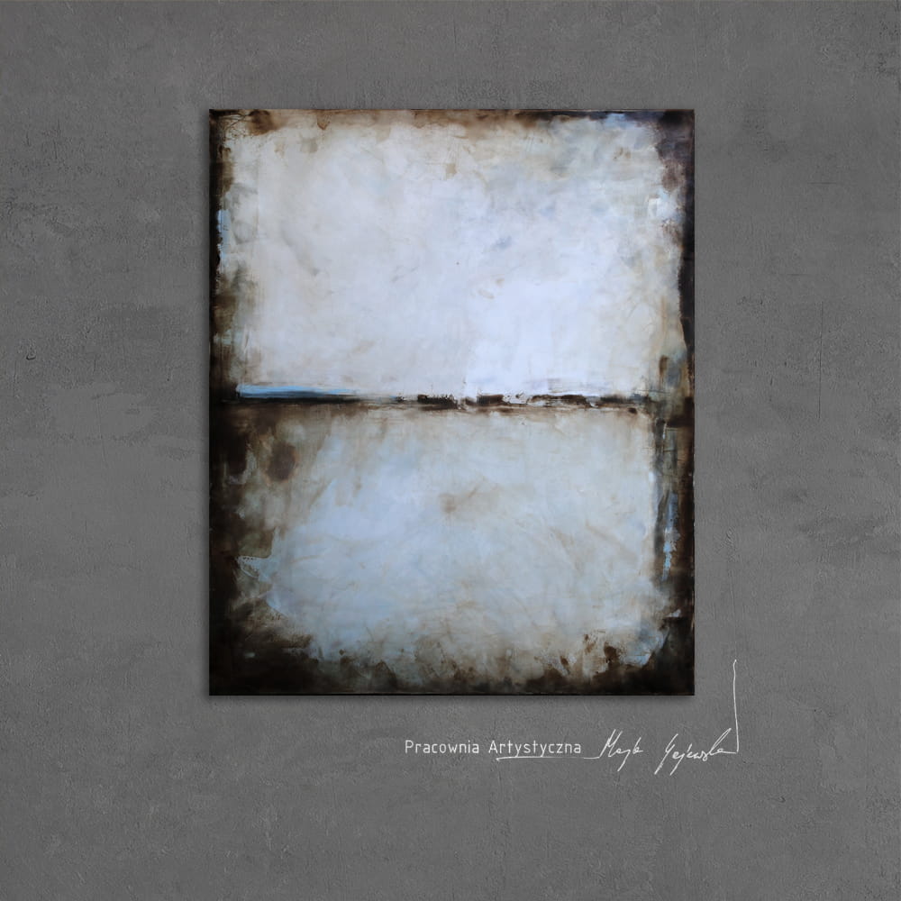 Ten minimalistyczny obraz, w którym dominuje biel, grafit z odcieniami brązu, to wysublimowana gra kolorów, płaszczyzn i linii niekiedy zanikających, innym razem stawiających granicę. Subtelna kolorystyka i zredukowana kompozycja pozwoli na wkomponowanie się obrazu olejnego we współczesne wnętrza z dodatkami szarości czy elementami drewna.