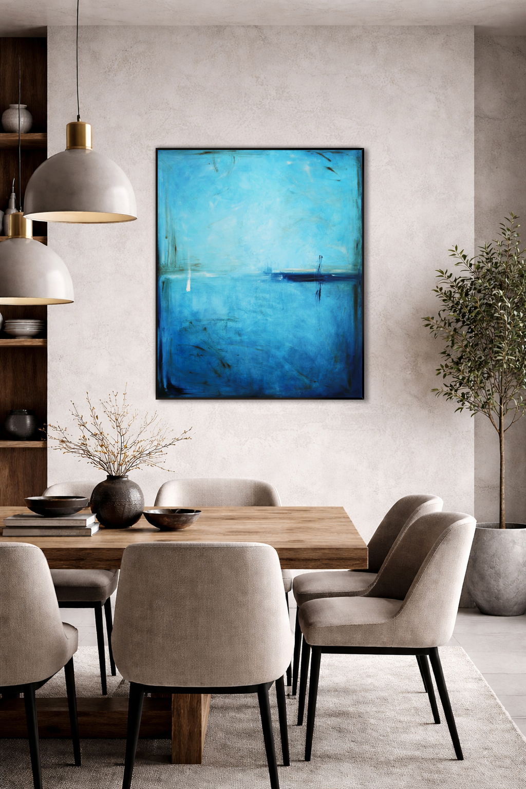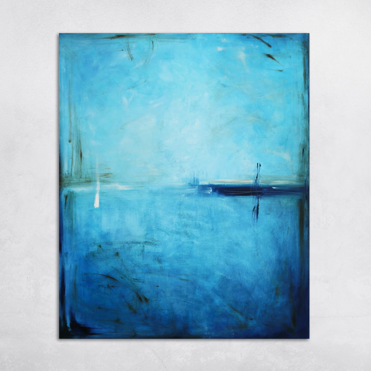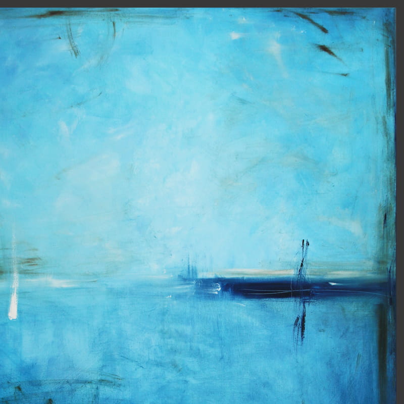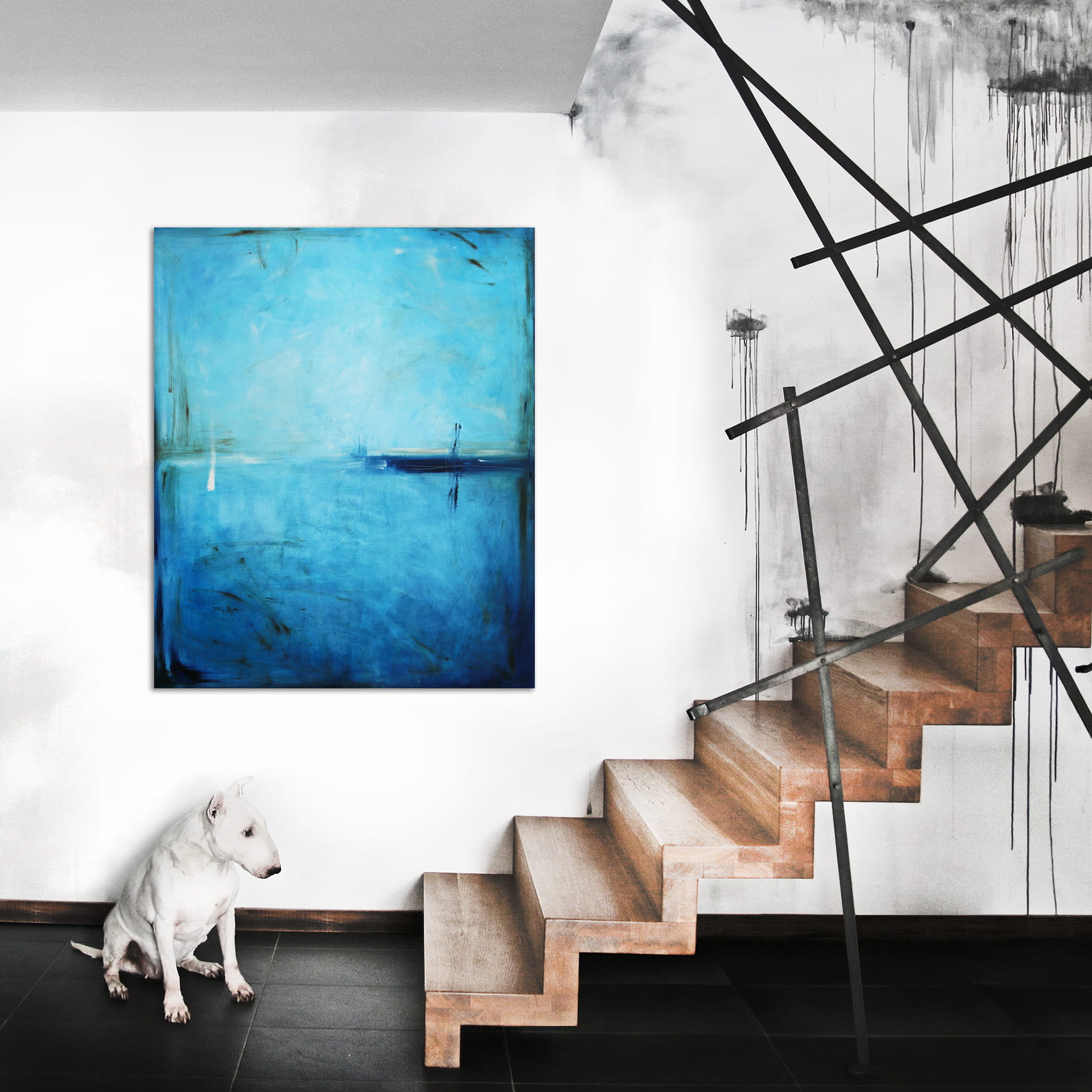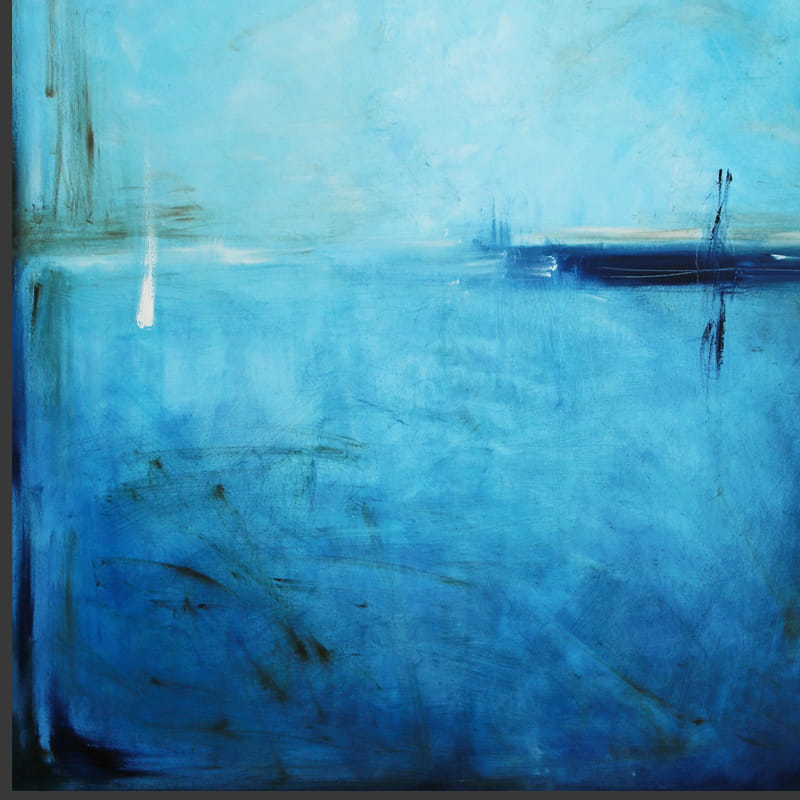 Subtelny obraz olejny, w którym dominuje paleta niebieskiego przechodząca od delikatnego błękitu, aż po ciemny granat. Środek wyznacza, czasem zanikająca innym razem stawiająca granicę, linia bieli i granatu. Łagodna kolorystyka pozwoli na wpasowanie się obrazu we współczesne wnętrza elegancko podkreślając przestrzeń salonu czy sypialni.