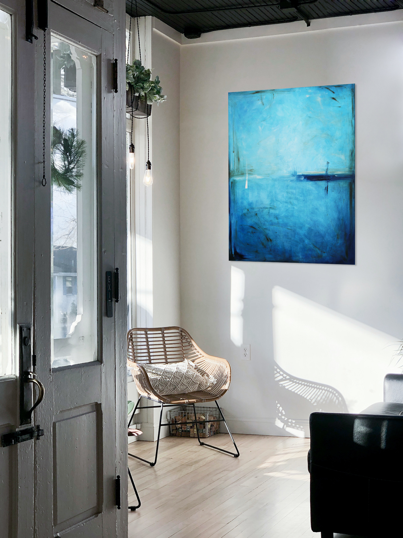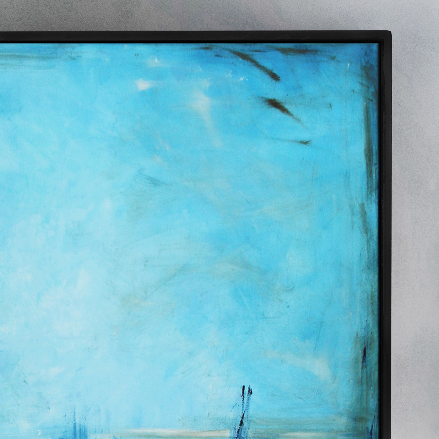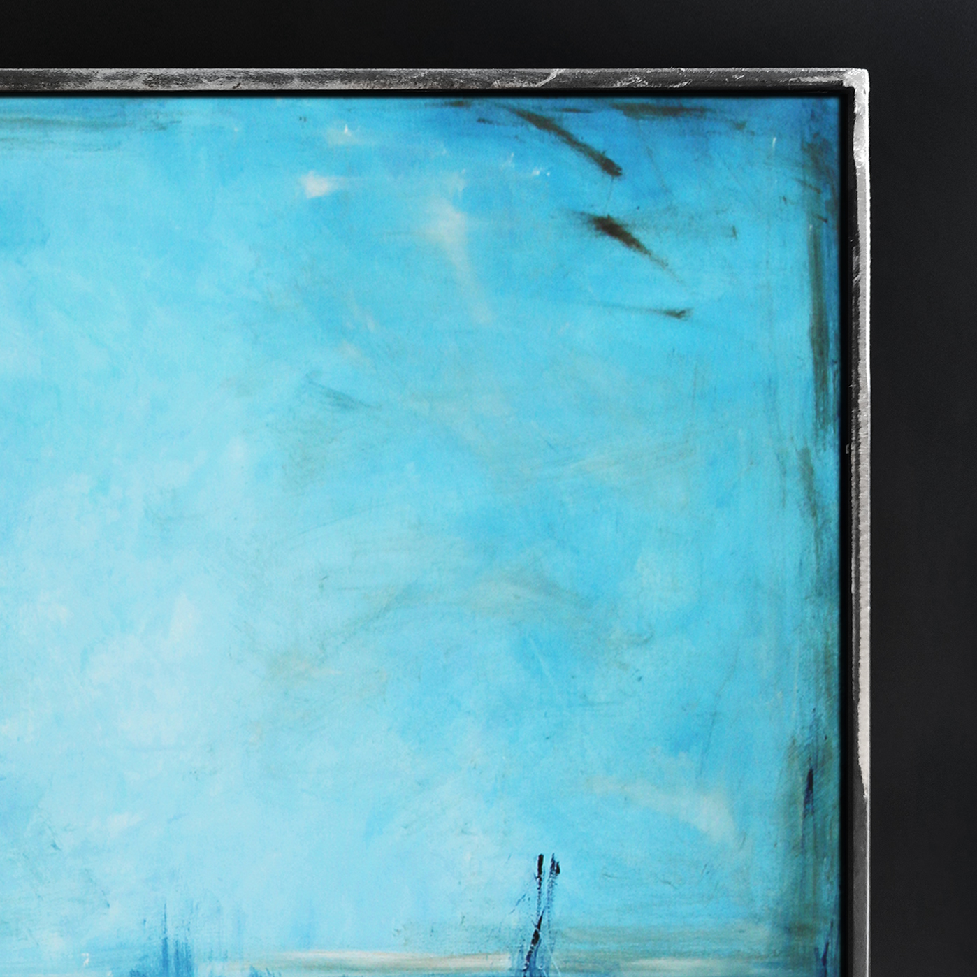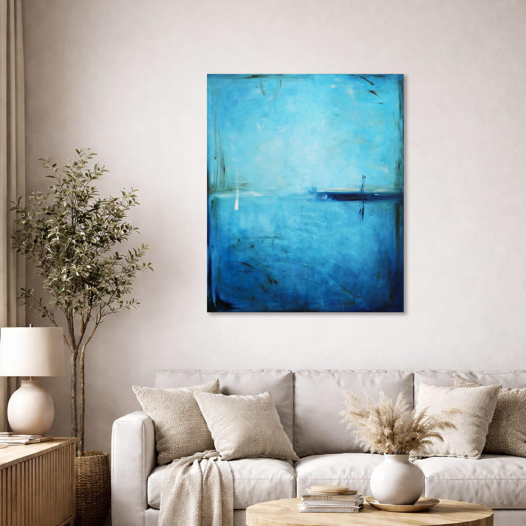 Subtelny obraz olejny, w którym dominuje paleta niebieskiego przechodząca od delikatnego błękitu, aż po ciemny granat. Środek wyznacza, czasem zanikająca innym razem stawiająca granicę, linia bieli i granatu. Łagodna kolorystyka pozwoli na wpasowanie się obrazu we współczesne wnętrza elegancko podkreślając przestrzeń salonu czy sypialni.