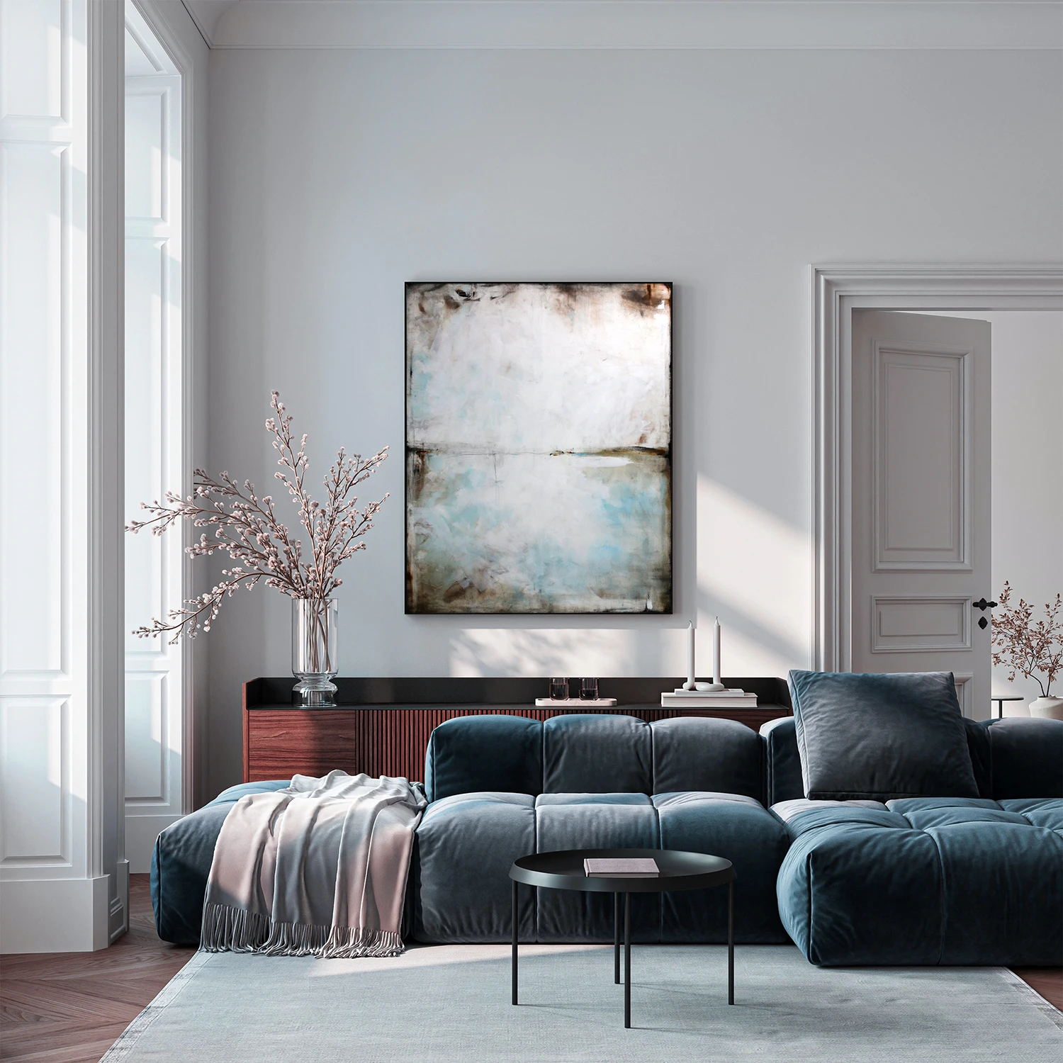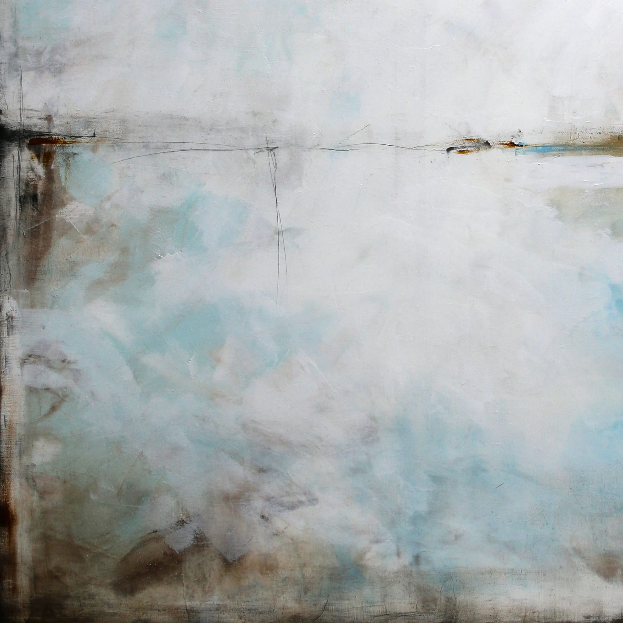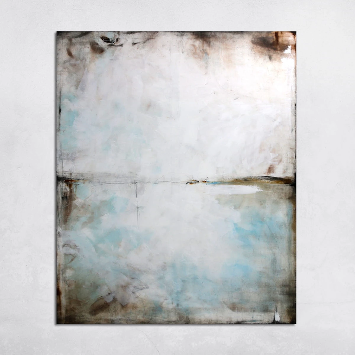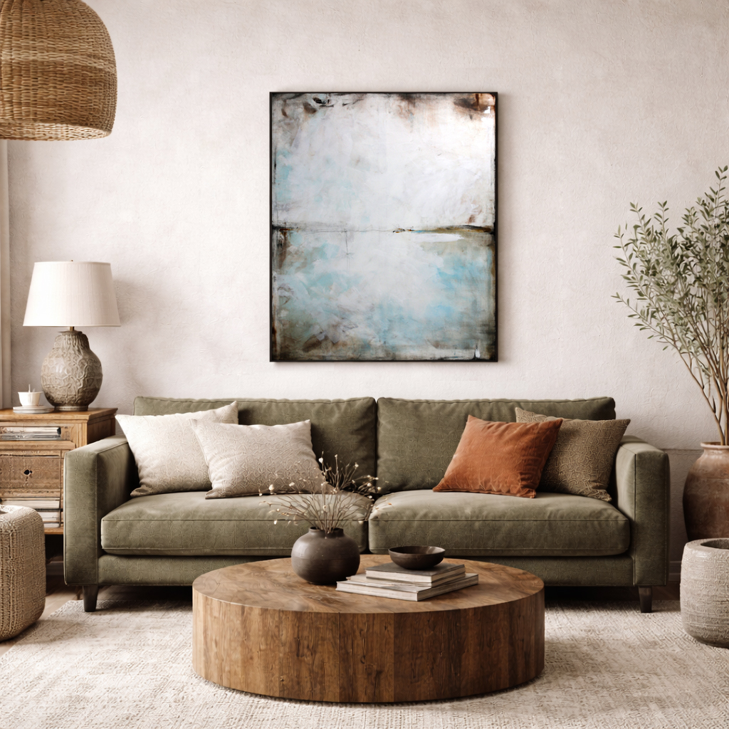 Błękit i sepia I to minimalistyczny obraz, w którym dominuje szarość, biel i delikatne akcenty niebieskiego. Na pierwszy rzut oka obraz kojarzy się z abstrakcyjnym pejzażem. Jednakże jest to wysublimowana gra kolorów, płaszczyzn i linii niekiedy zanikających, innym razem stawiających granicę. Subtelna kolorystyka i zredukowana kompozycja pozwoli na wkomponowanie się obrazu olejnego we współczesne wnętrza z dodatkami szarości czy elementami drewna.