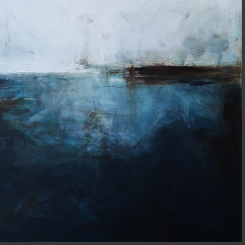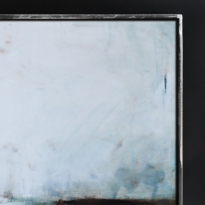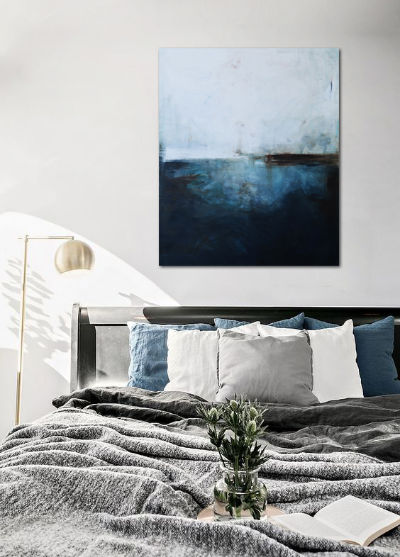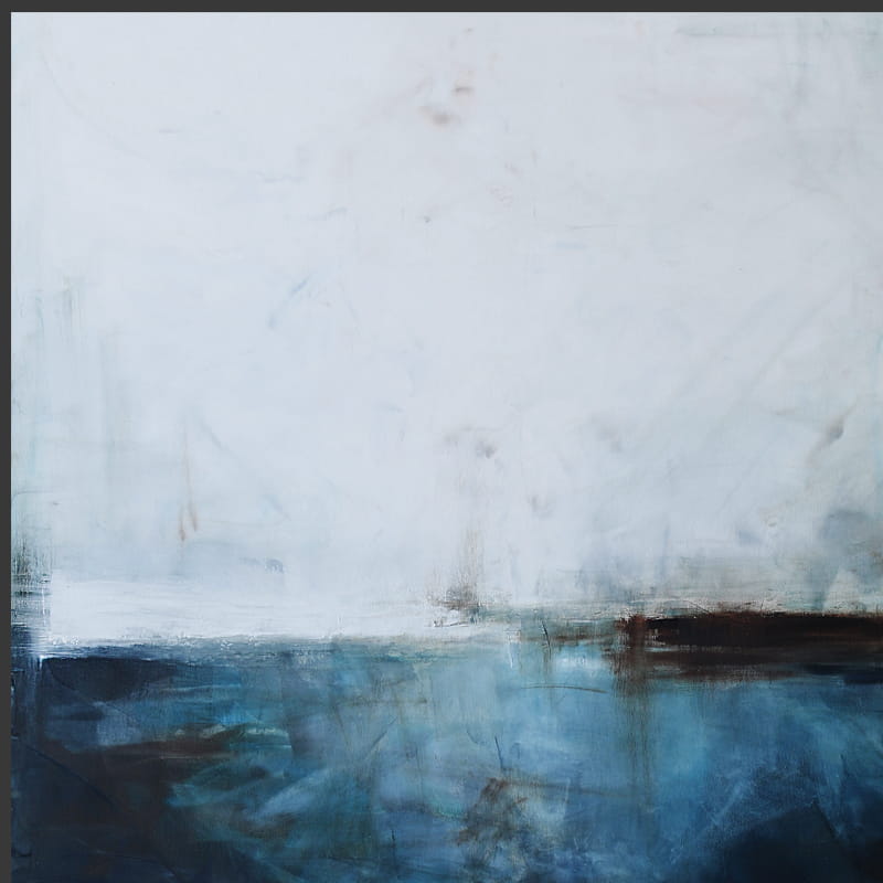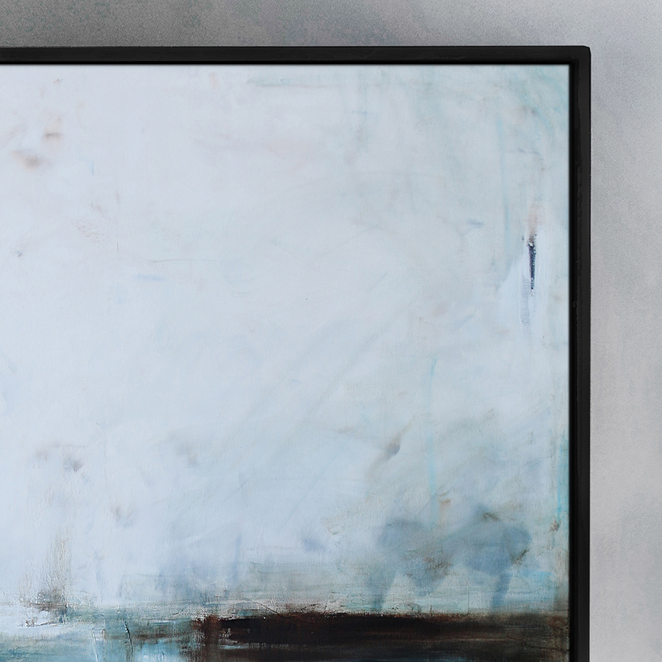 Subtelny obraz, w którym dominuje biel i paleta niebieskiego przechodząca od delikatnego błękitu, aż po ciemną ultramarynę. Środek wyznacza, niekiedy zanikająca innym razem stawiająca granicę, linia bieli i brązu. Na pierwszy rzut oka kojarzy się z abstrakcyjnym pejzażem. Jednakże jest to wysublimowana gra kolorów i płaszczyzn. Łagodna kolorystyka pozwoli na wpasowanie się obrazu olejnego we współczesne wnętrza z dodatkami szarości oraz elementami drewna elegancko podkreślając przestrzeń salonu czy sypialni.