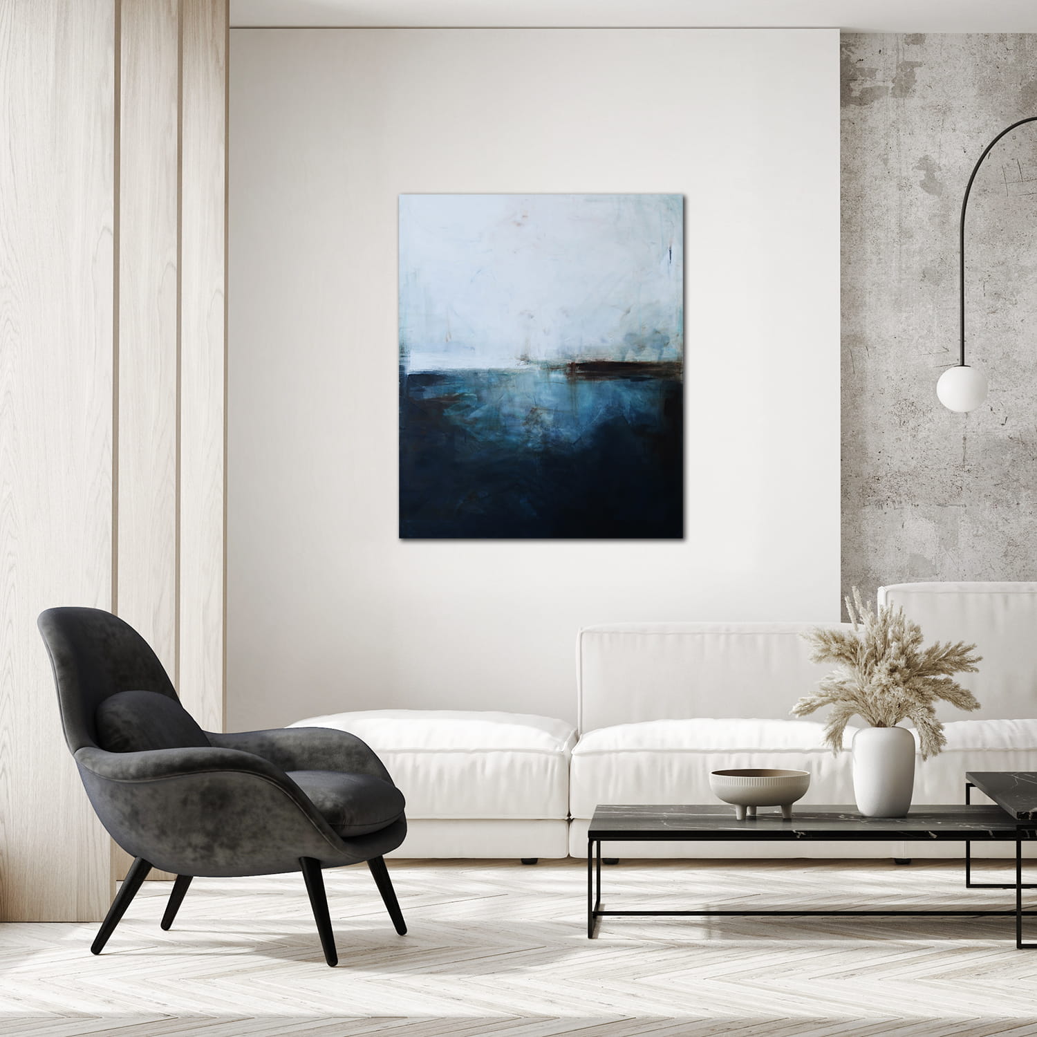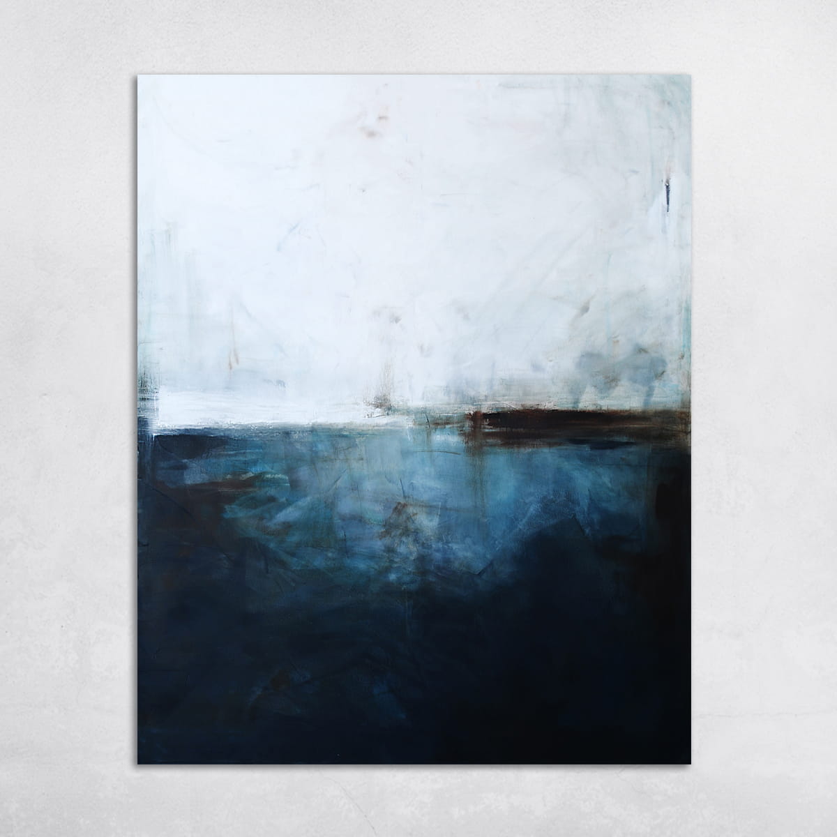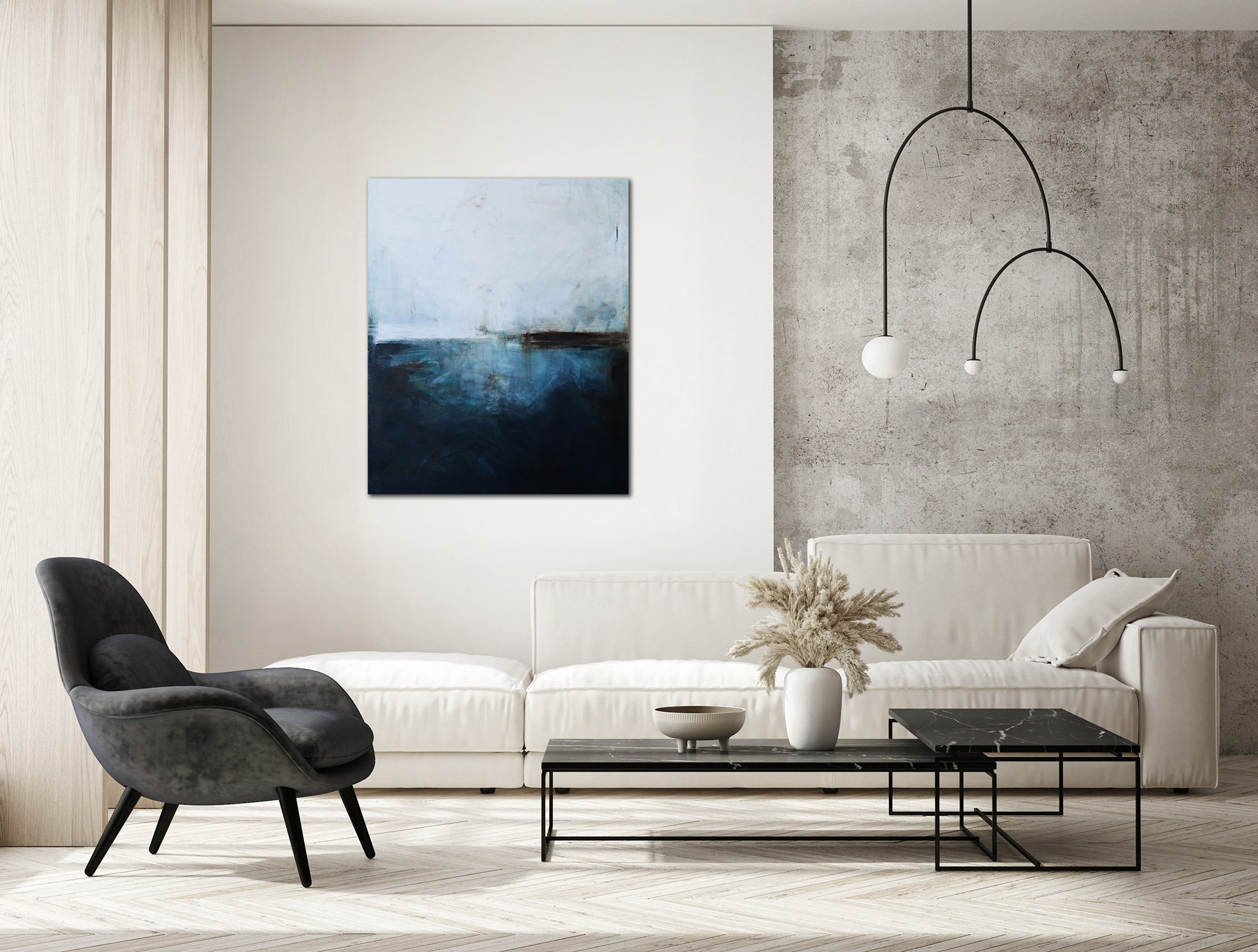 Subtelny obraz, w którym dominuje biel i paleta niebieskiego przechodząca od delikatnego błękitu, aż po ciemną ultramarynę. Środek wyznacza, niekiedy zanikająca innym razem stawiająca granicę, linia bieli i brązu. Na pierwszy rzut oka kojarzy się z abstrakcyjnym pejzażem. Jednakże jest to wysublimowana gra kolorów i płaszczyzn. Łagodna kolorystyka pozwoli na wpasowanie się obrazu olejnego we współczesne wnętrza z dodatkami szarości oraz elementami drewna elegancko podkreślając przestrzeń salonu czy sypialni.