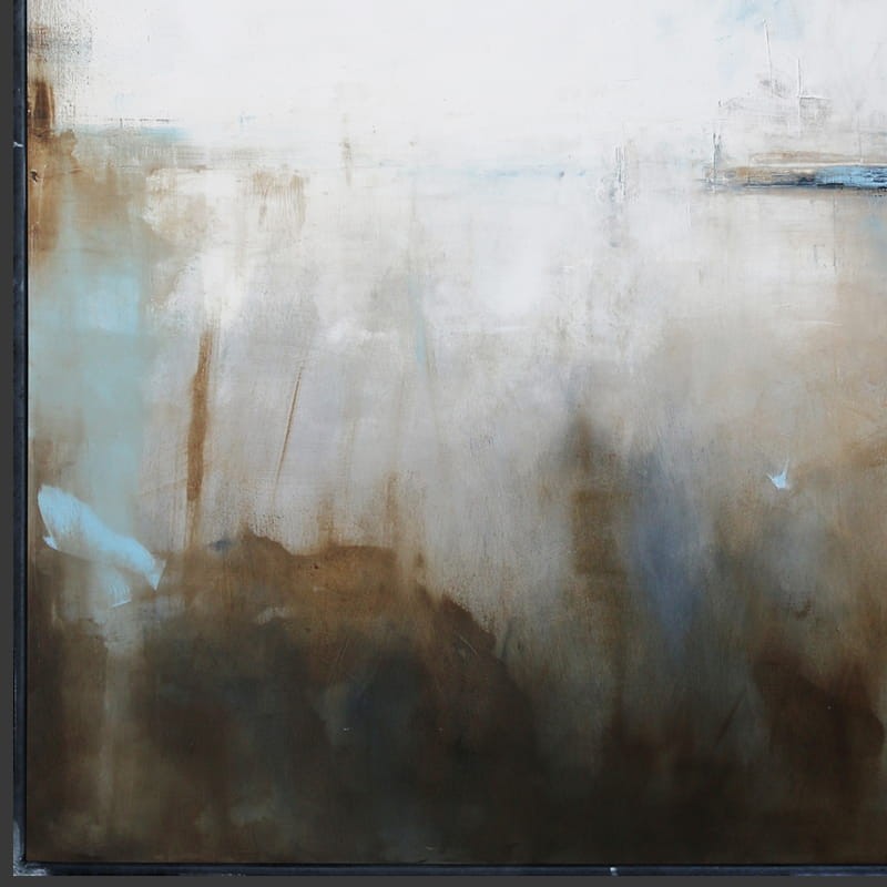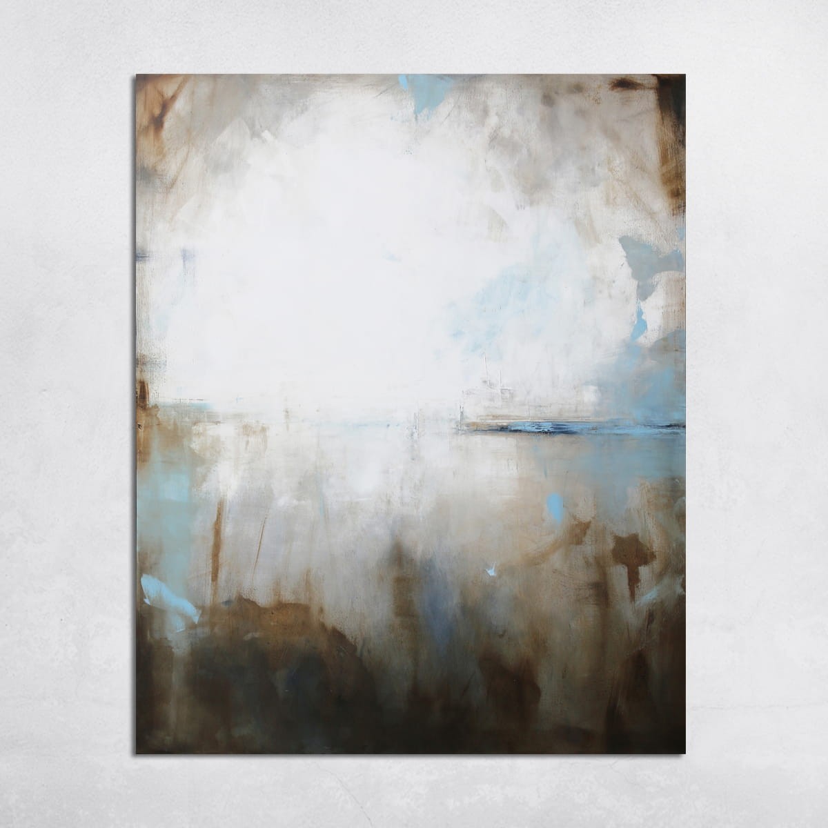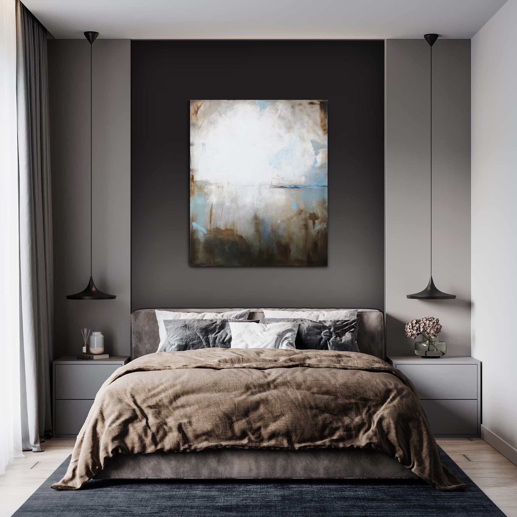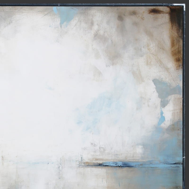 Nowoczesny obraz w ciepłych tonacjach szarego, beżach i brązach akcentem błękitu. Na pierwszy rzut oka kojarzy się z abstrakcyjnym pejzażem. Jednakże jest to wysublimowana gra kolorów, płaszczyzn i linii niekiedy zanikających, innym razem stawiających granicę. Subtelny obraz olejny doskonale wpasuje się we wnętrze salonu, gabinetu czy sypialni.