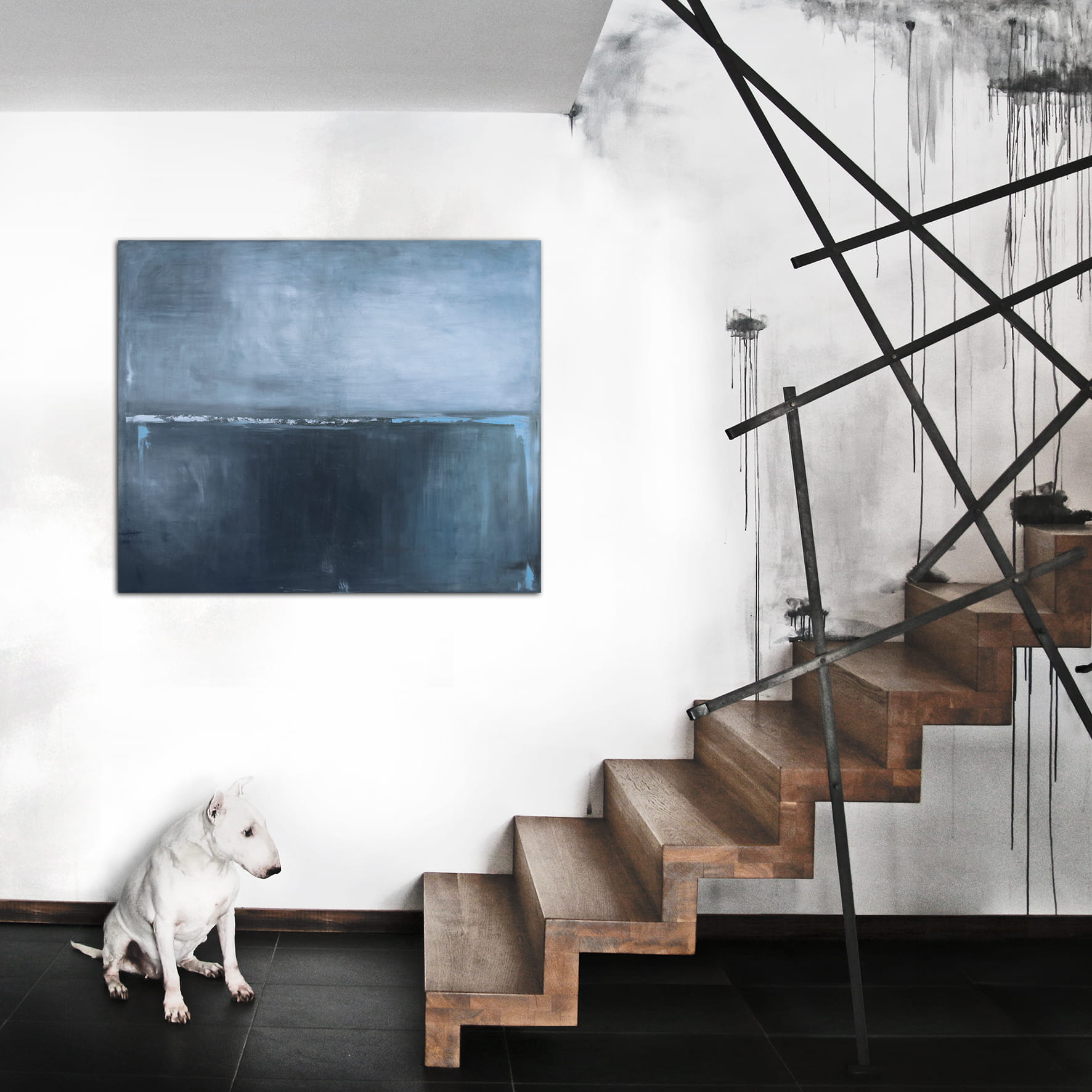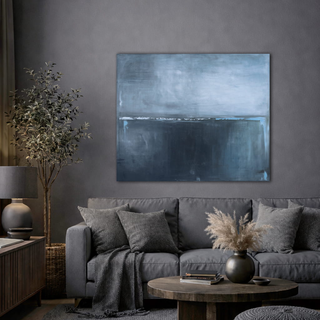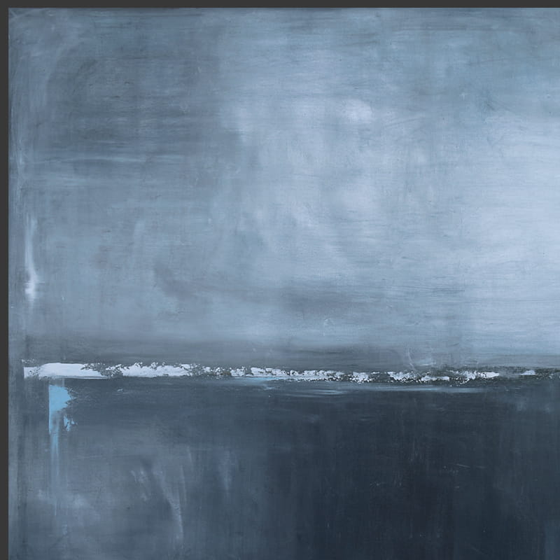 Minimalistyczny, grafitowy obraz olejny o harmonijnym nastroju. W centralną kompozycję obrazu wpisana została intensywniejsza kolorystycznie pozioma linia, niekiedy zanikająca, innym razem stawiająca granicę. Wysublimowana gra kolorów i płaszczyzn wyzwala w widzu nieskrępowaną dowolność interpretacji. Obraz olejny pasuje do salonu i sypialni wnosząc nienachalny akcent do wnętrza.