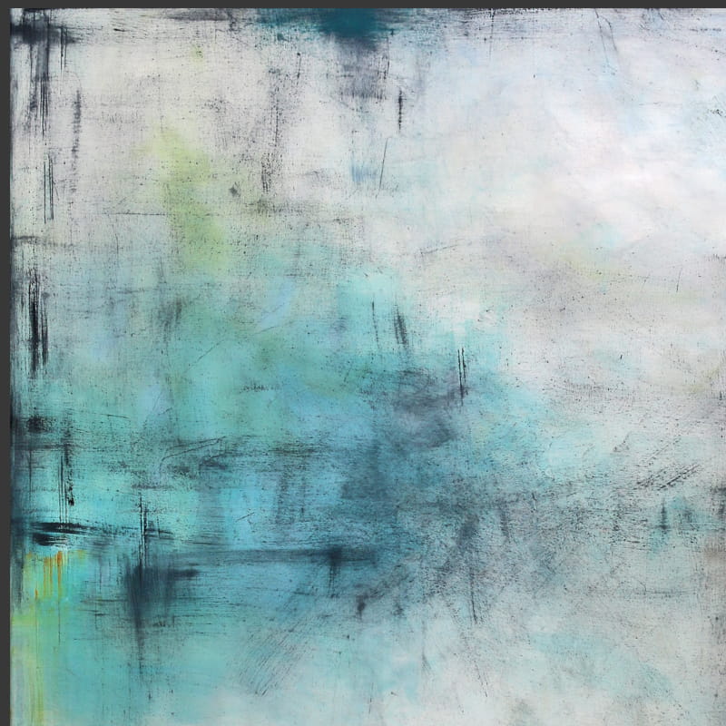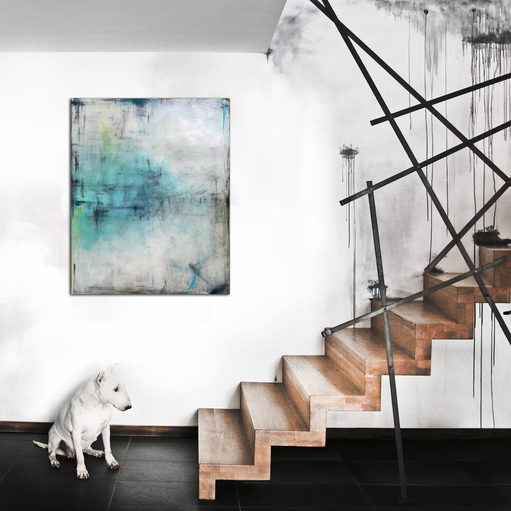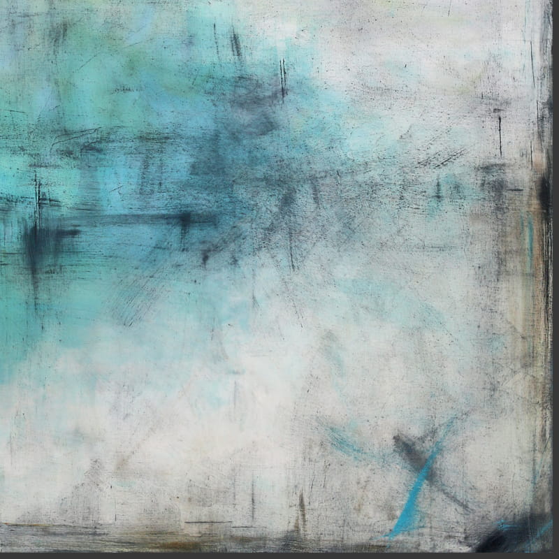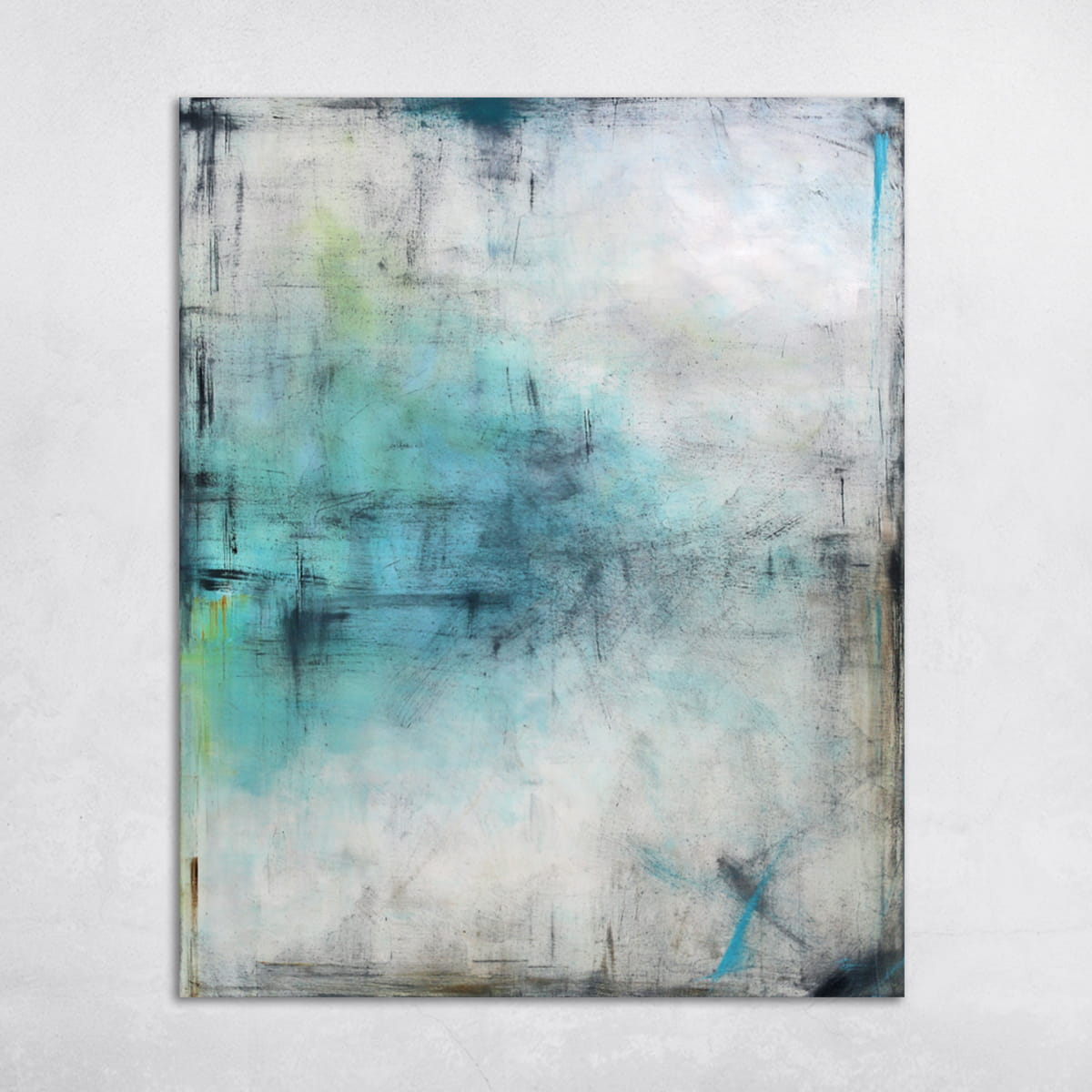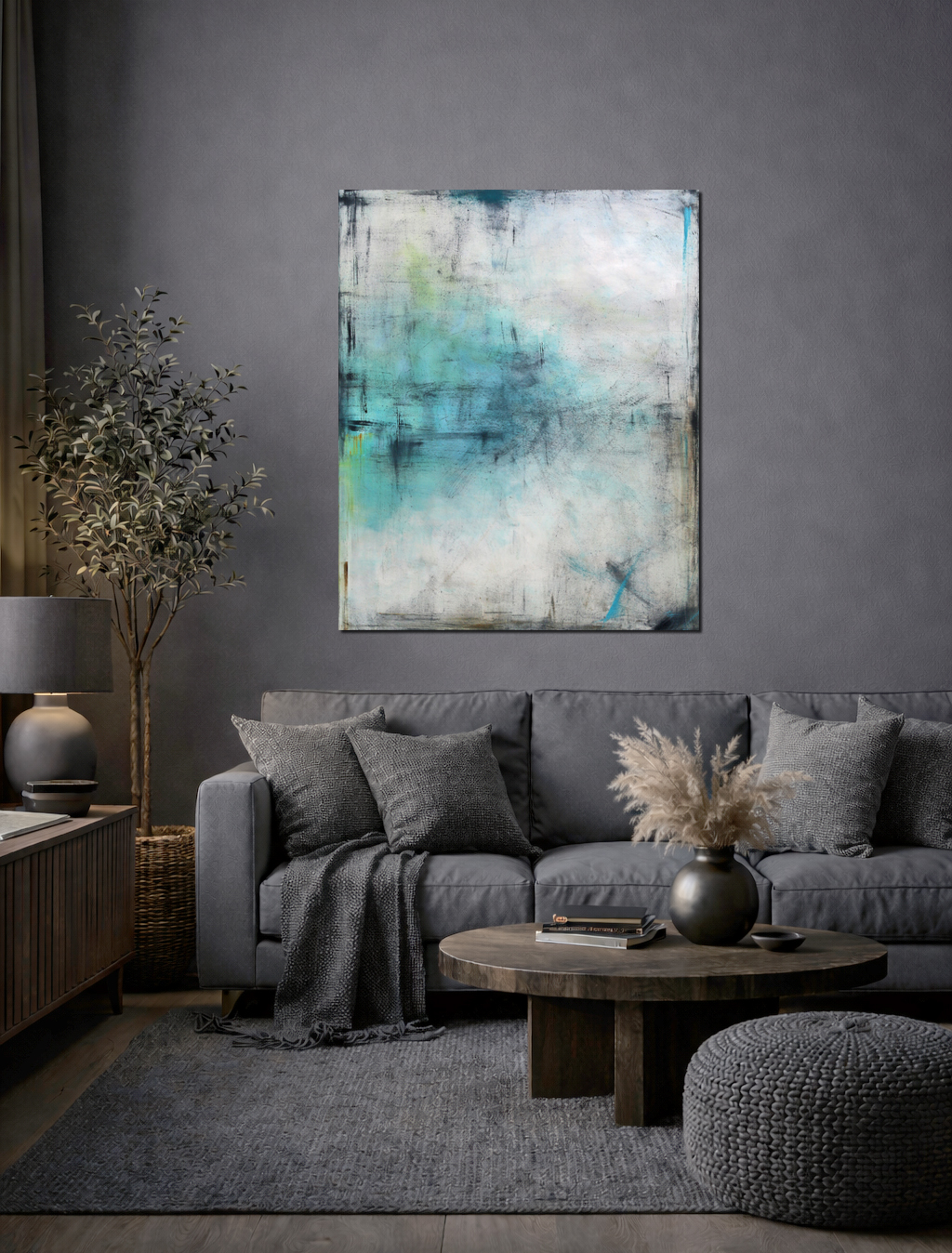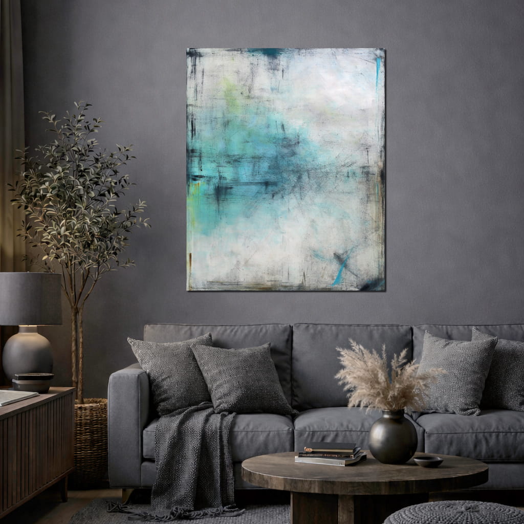 Minimalistyczny obraz o spokojnej kolorystyce, w którym na pierwszy plan wychodzą akcenty turkusu. Wysublimowana gra kolorów, płaszczyzn i linii niekiedy zanikających, innym razem stawiających granicę wyzwala w widzu nieskrępowaną dowolność interpretacji. Obraz olejny pasuje do salonu i sypialni wnosząc świeżość i piękno natury do wnętrza.