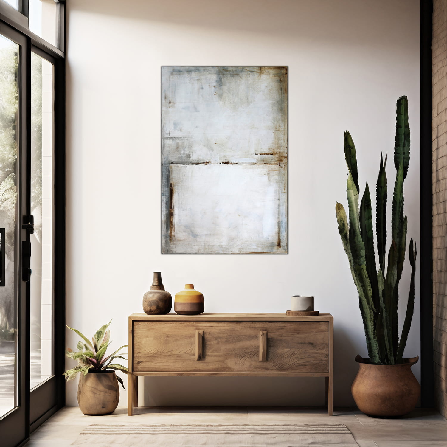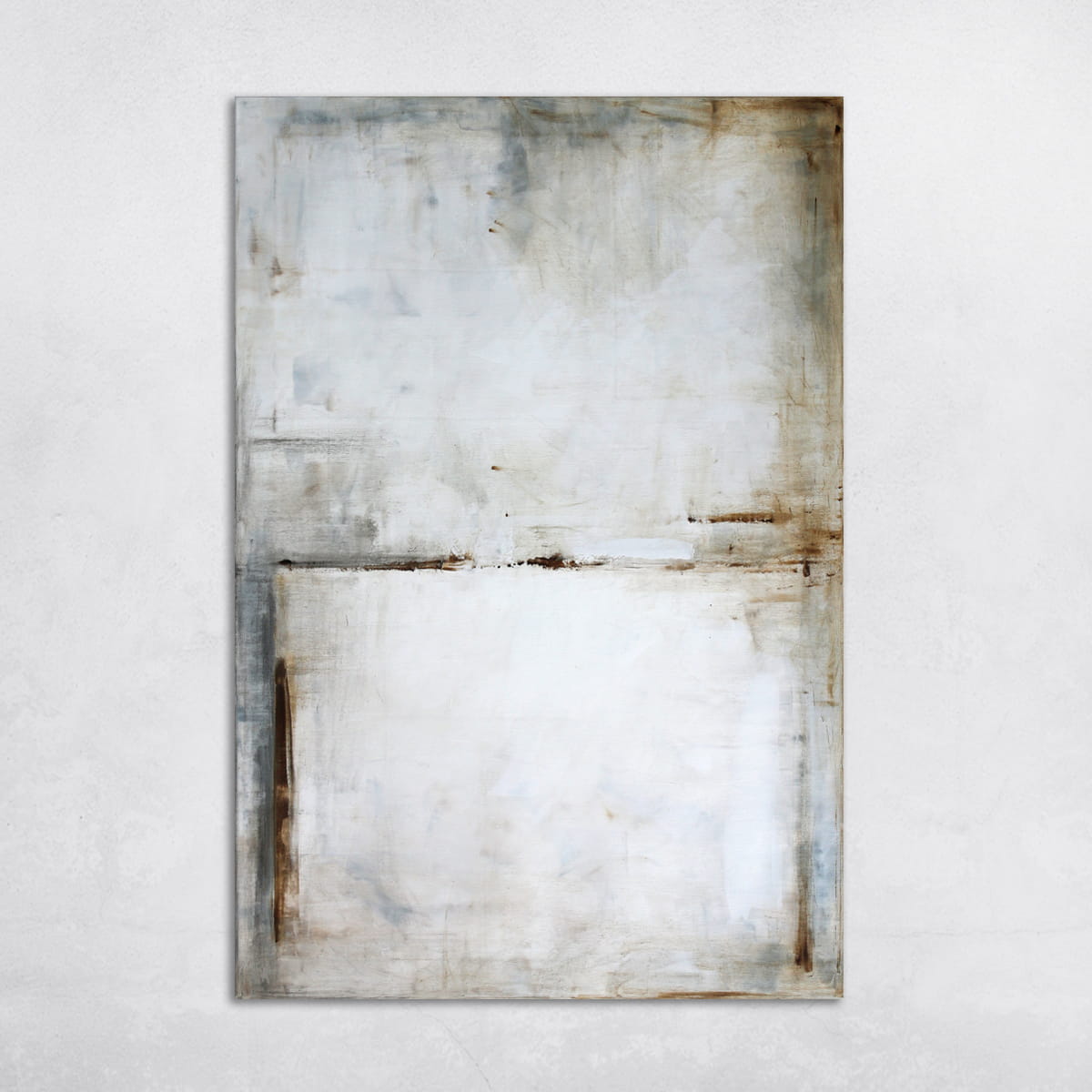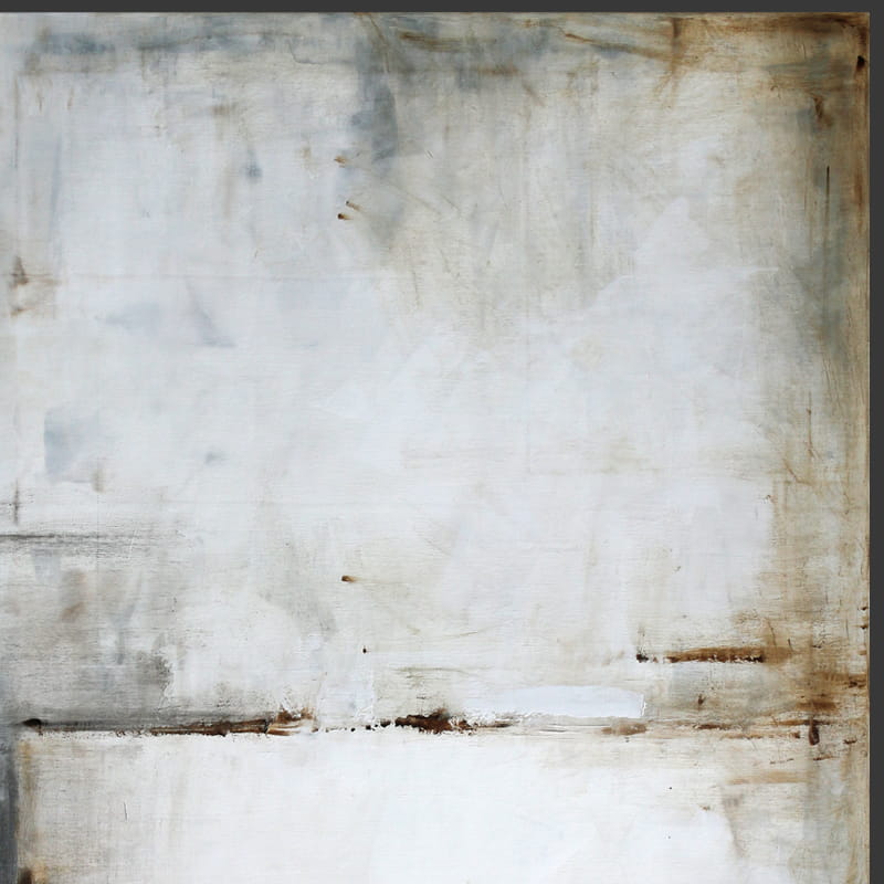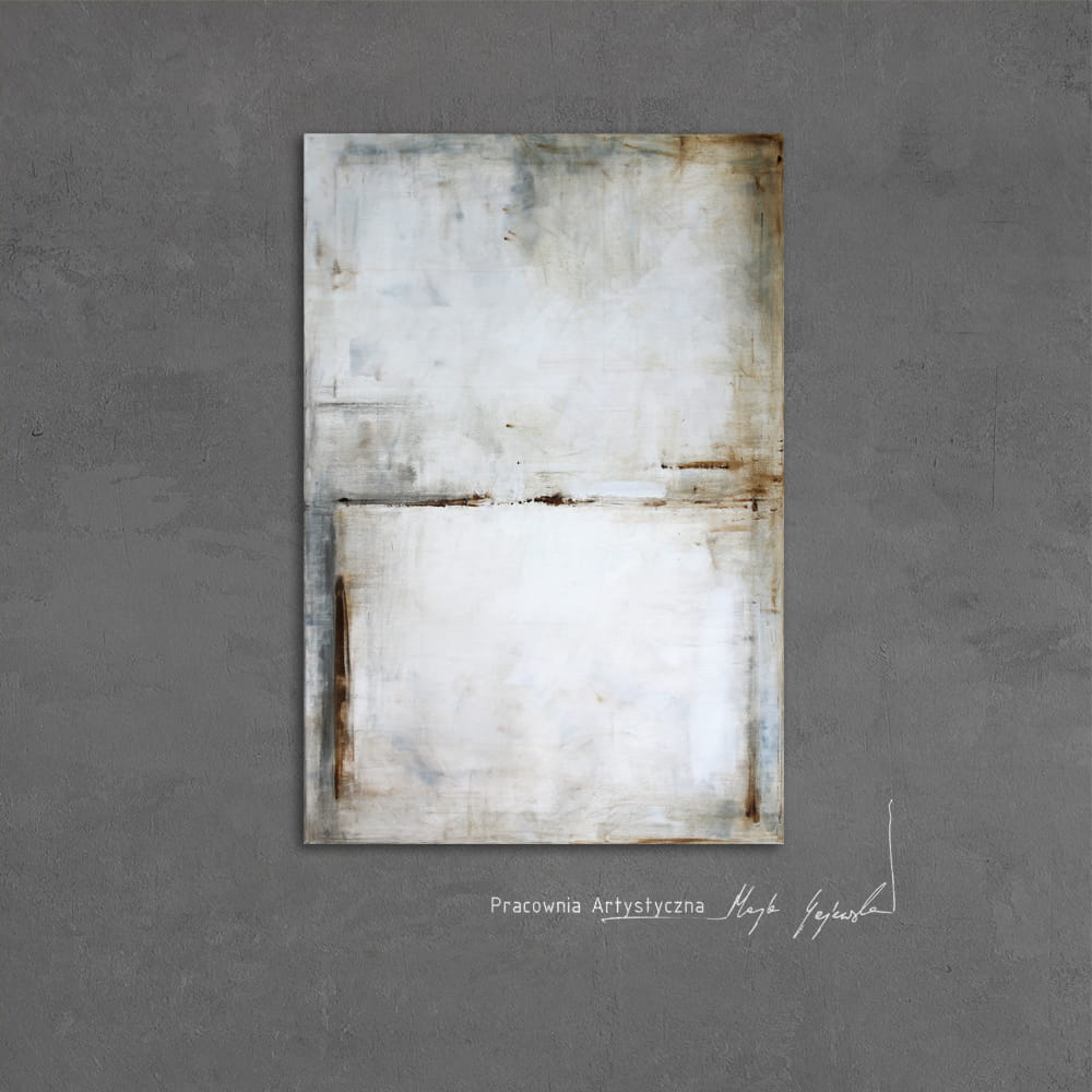 Minimalistyczny obraz z dominującą gamą bieli i szarości, akcenty w kolorze sieny i brązu. Obraz może kojarzyć się z abstrakcyjnym pejzażem, jednakże jest to wysublimowana gra kolorów, płaszczyzn i linii niekiedy zanikających, innym razem stawiających granicę. Ważne jest to, co w pierwszej chwili uchwyci widz, który może sobie pozwolić na nieskrępowaną dowolność interpretacji. Neutralna kolorystyka obrazu doskonale sprawdzi się w większości pomieszczeń jako scalający motyw dekoracyjny.