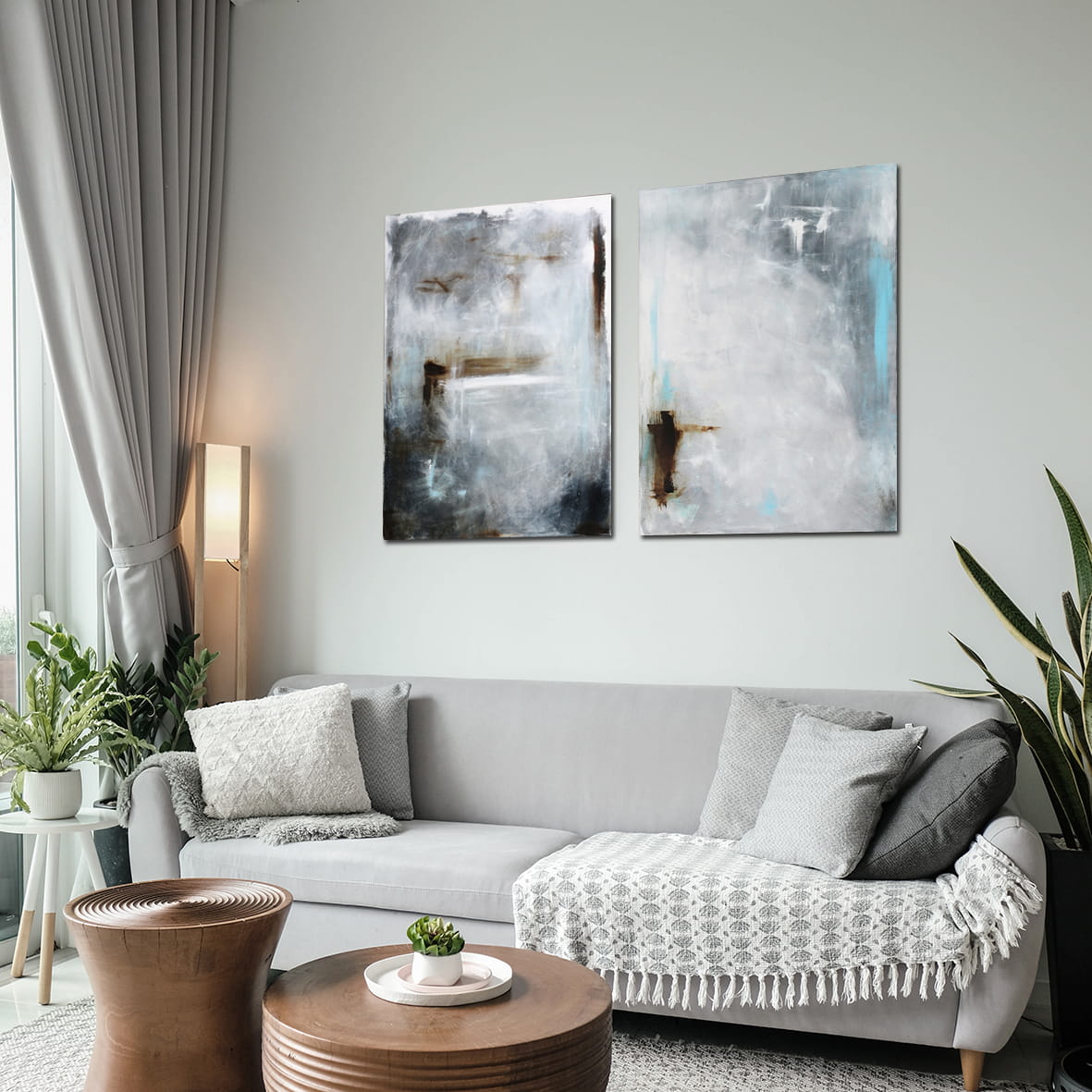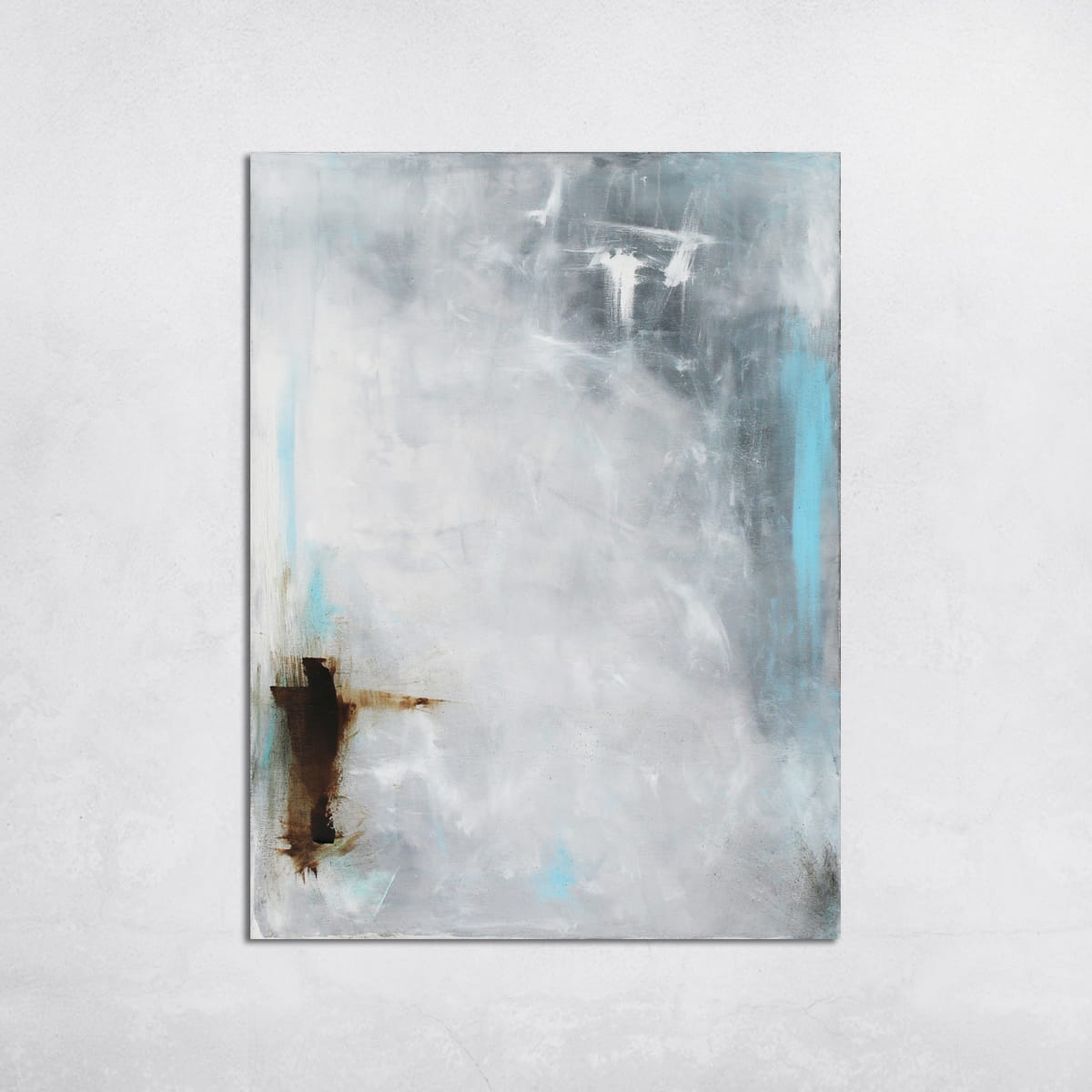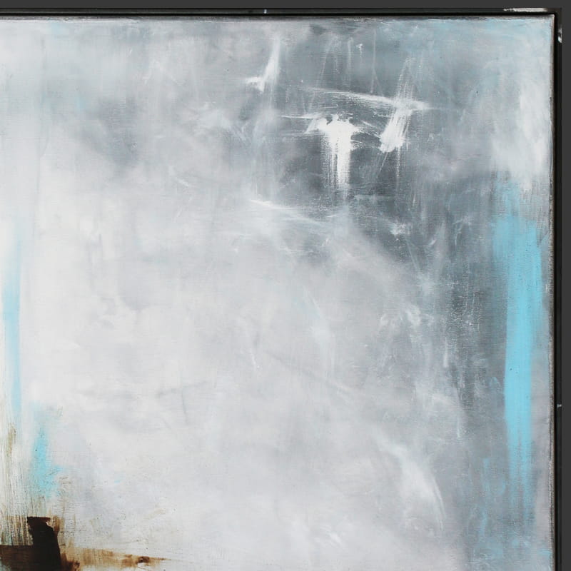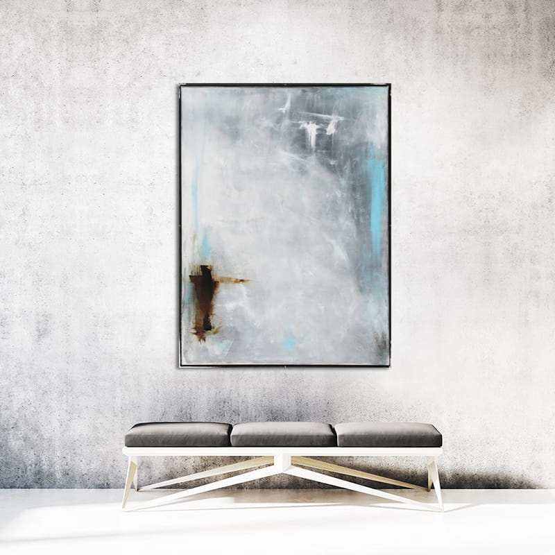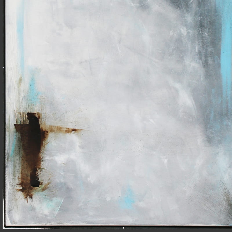 Nowoczesny obraz w neutralnej kolorystyce bieli, szarości z minimalnym akcentem błękitu i dla kontrastu brązu. Na pierwszy rzut oka kojarzy się z abstrakcyjnym pejzażem. Jednakże jest to wysublimowana gra kolorów, płaszczyzn i linii niekiedy zanikających, innym razem stawiających granicę. Subtelna kolorystyka i zredukowana kompozycja pozwoli na wkomponowanie się obrazu olejnego we współczesne wnętrza z dodatkami szarości czy elementami drewna.