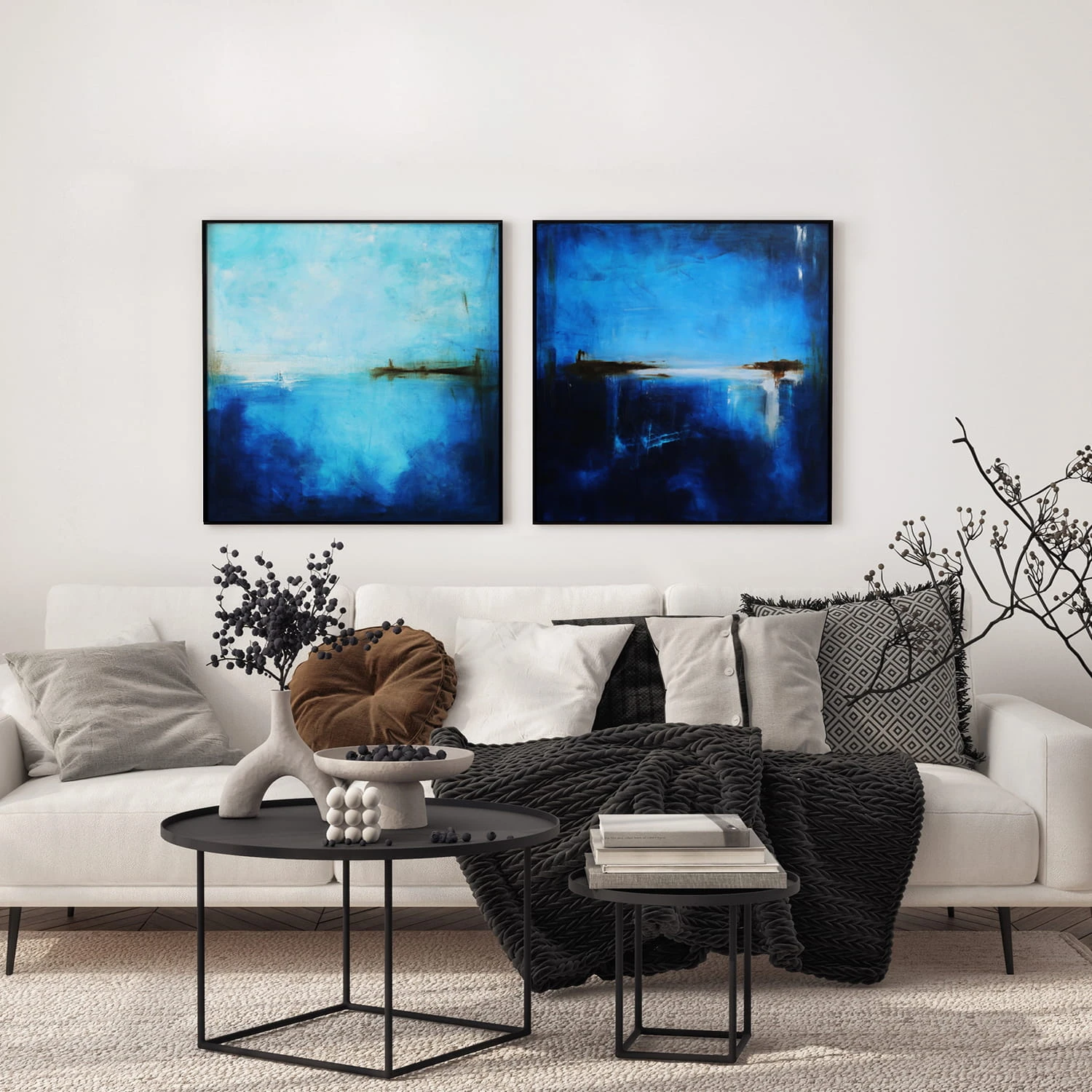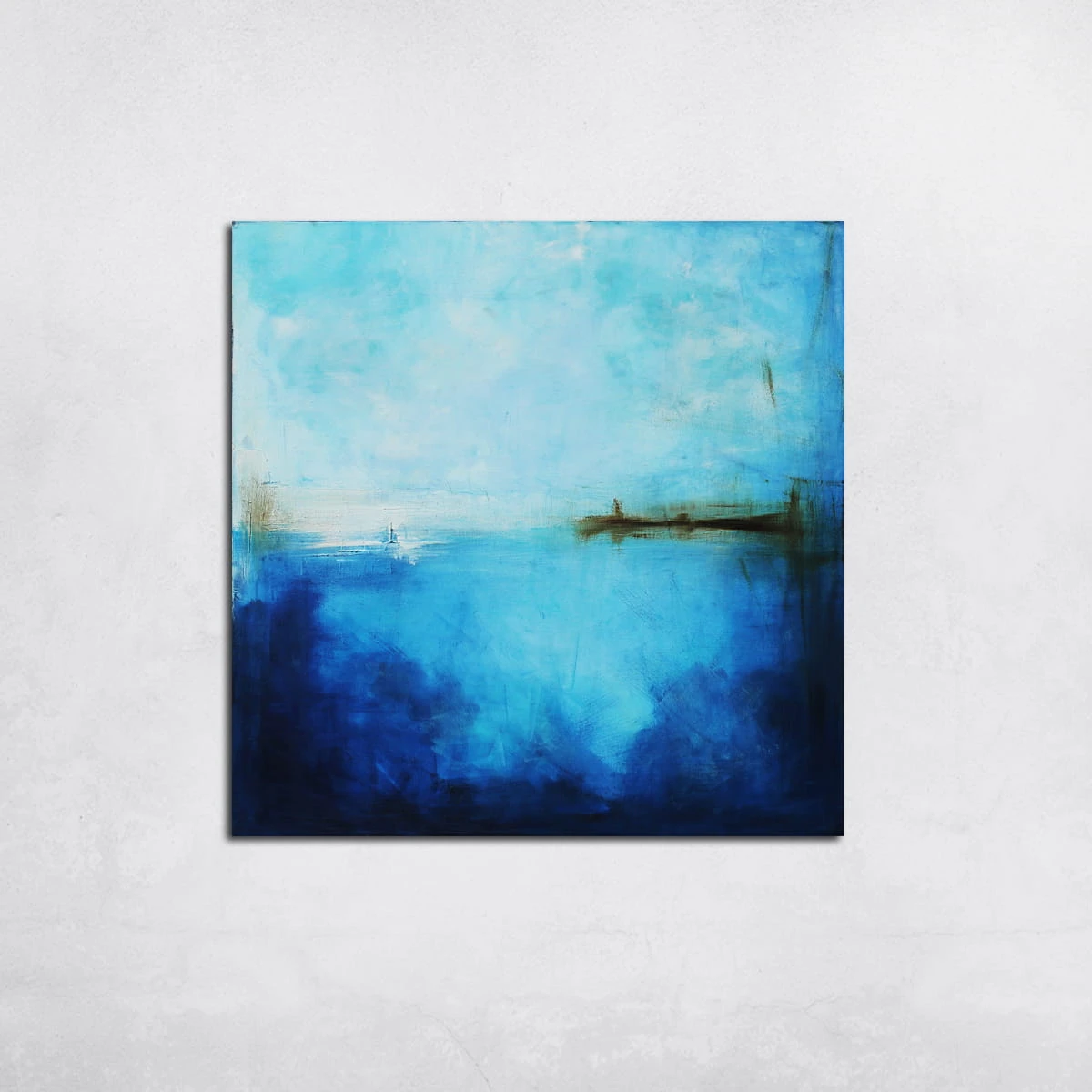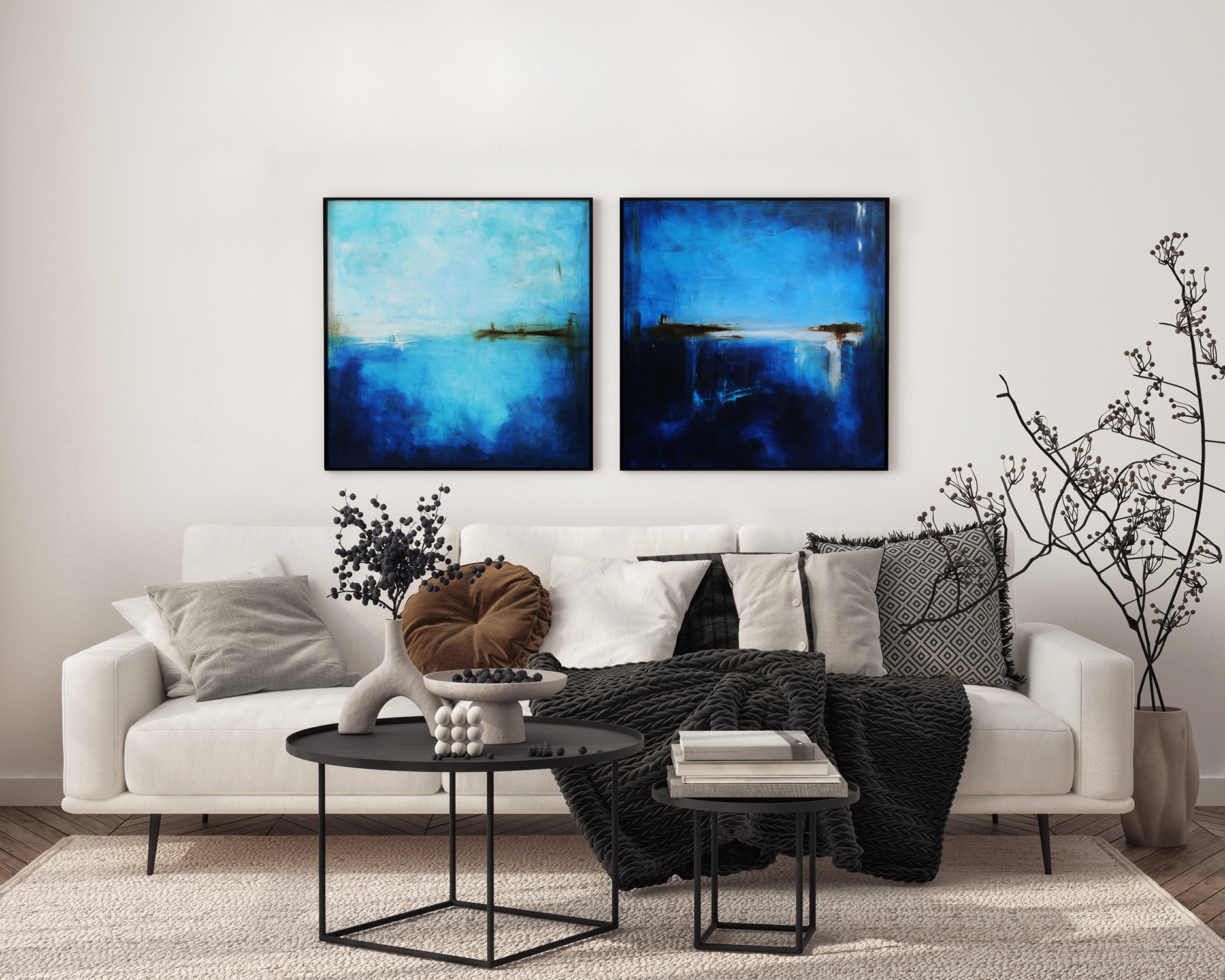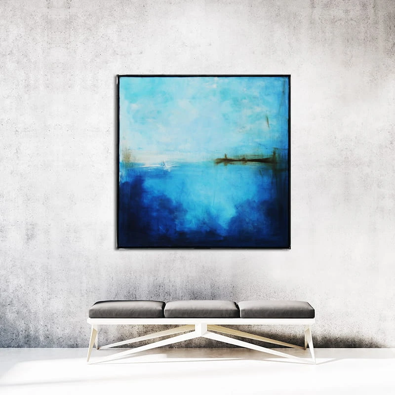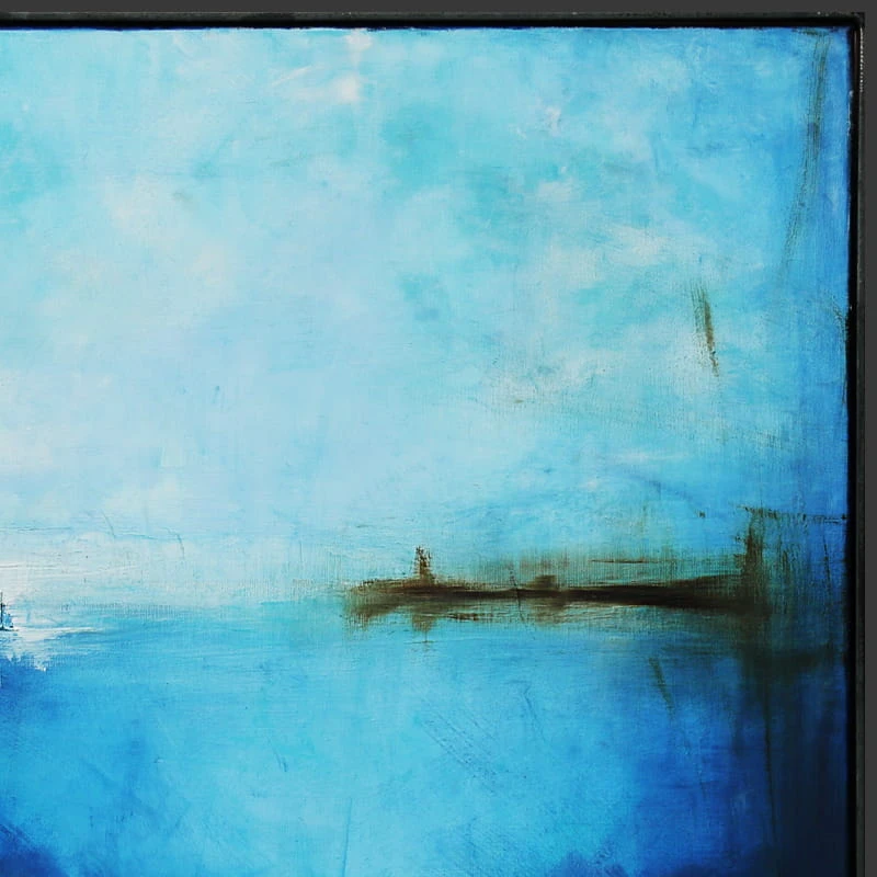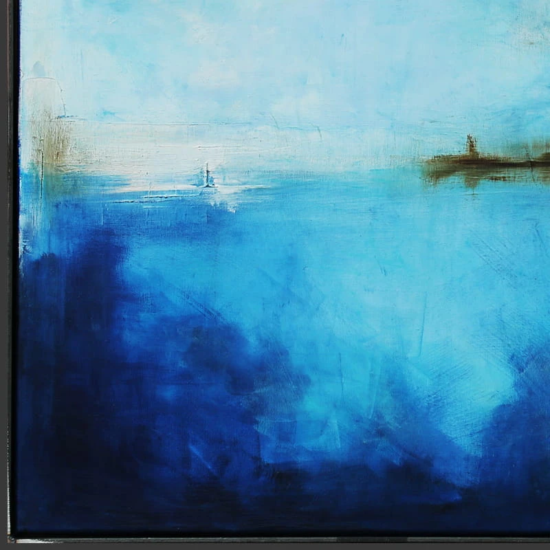 Olejny obraz abstrakcyjny w delikatnej niebieskiej tonacji. Na pierwszy rzut oka kojarzy się z abstrakcyjnym pejzażem, dla mnie jest to gra kolorów, płaszczyzn i linii niekiedy zanikających, innym razem stawiających granicę. Subtelny obraz olejny doskonale wpasuje się we wnętrze salonu, gabinetu czy sypialni.