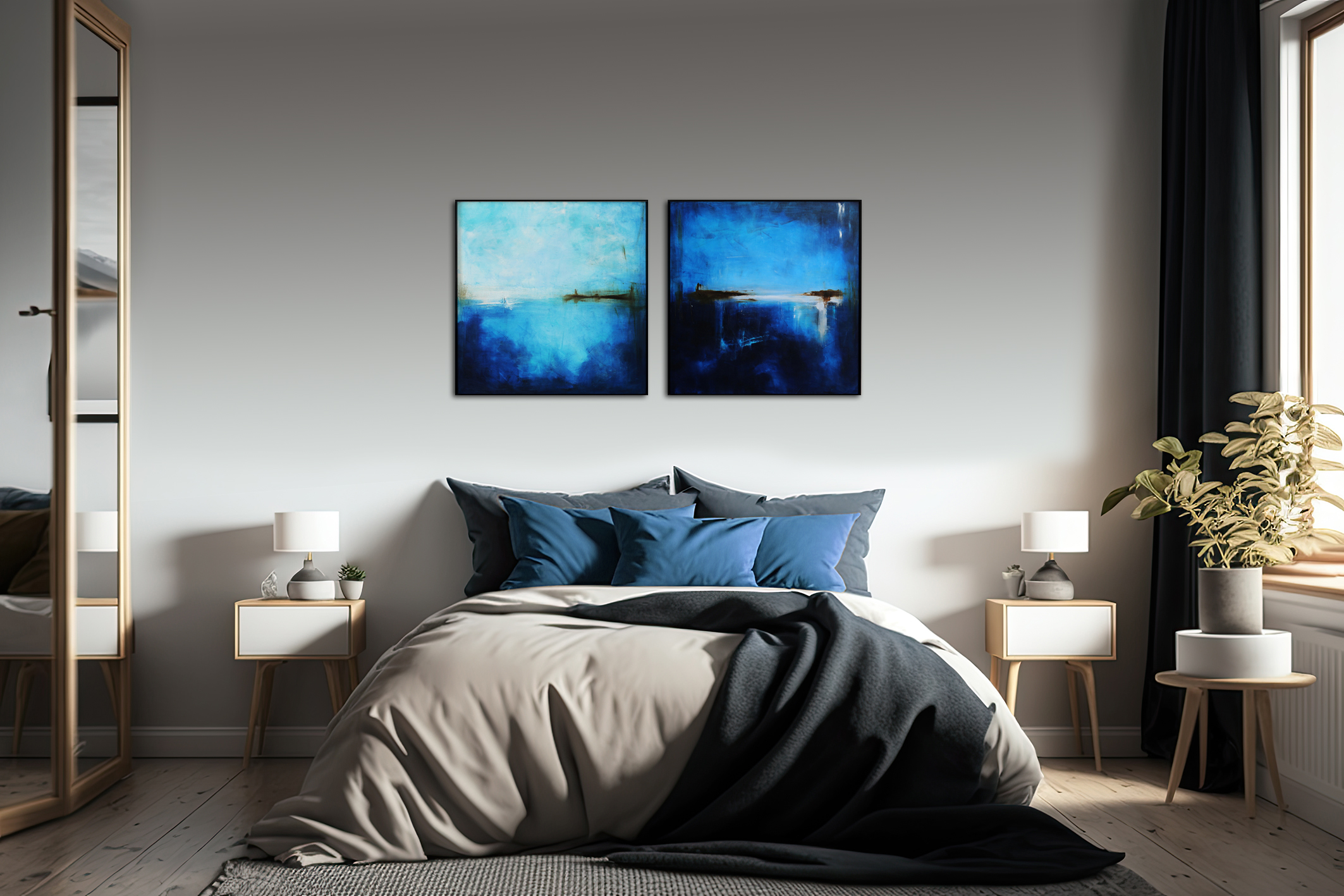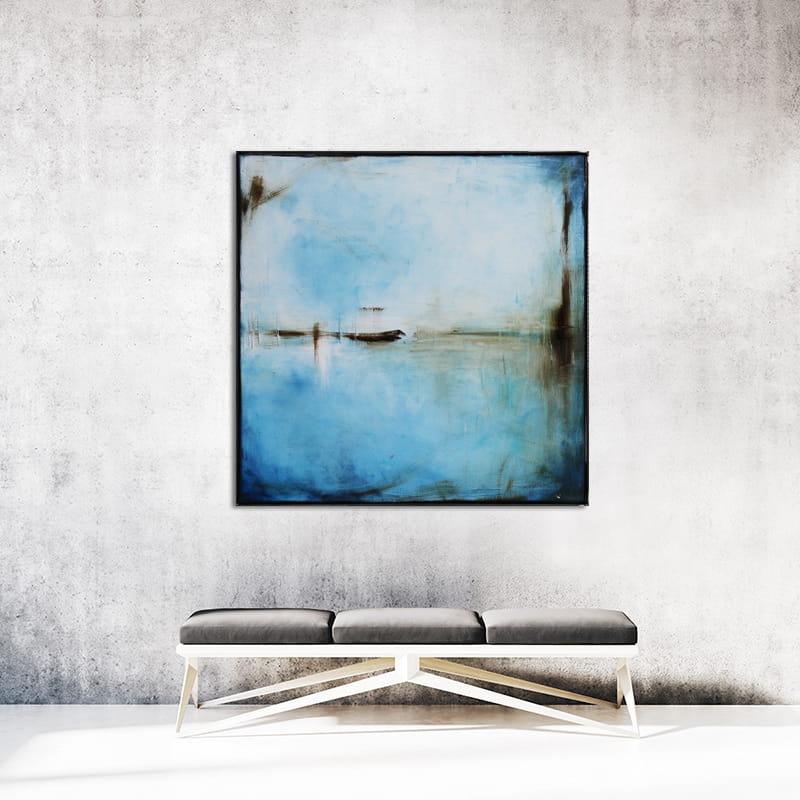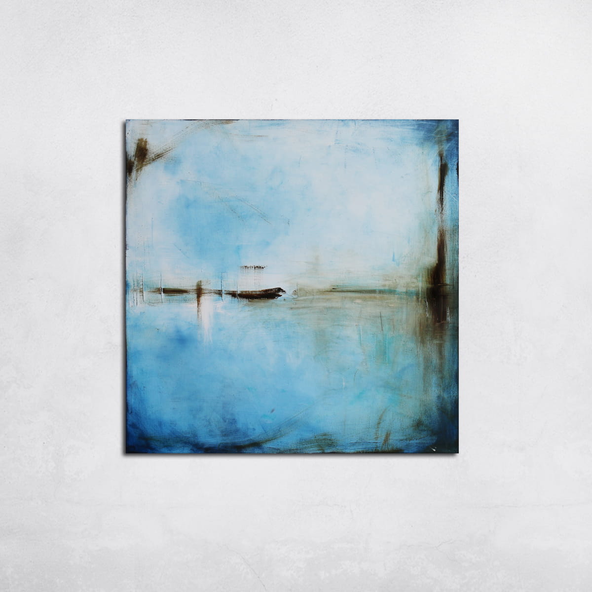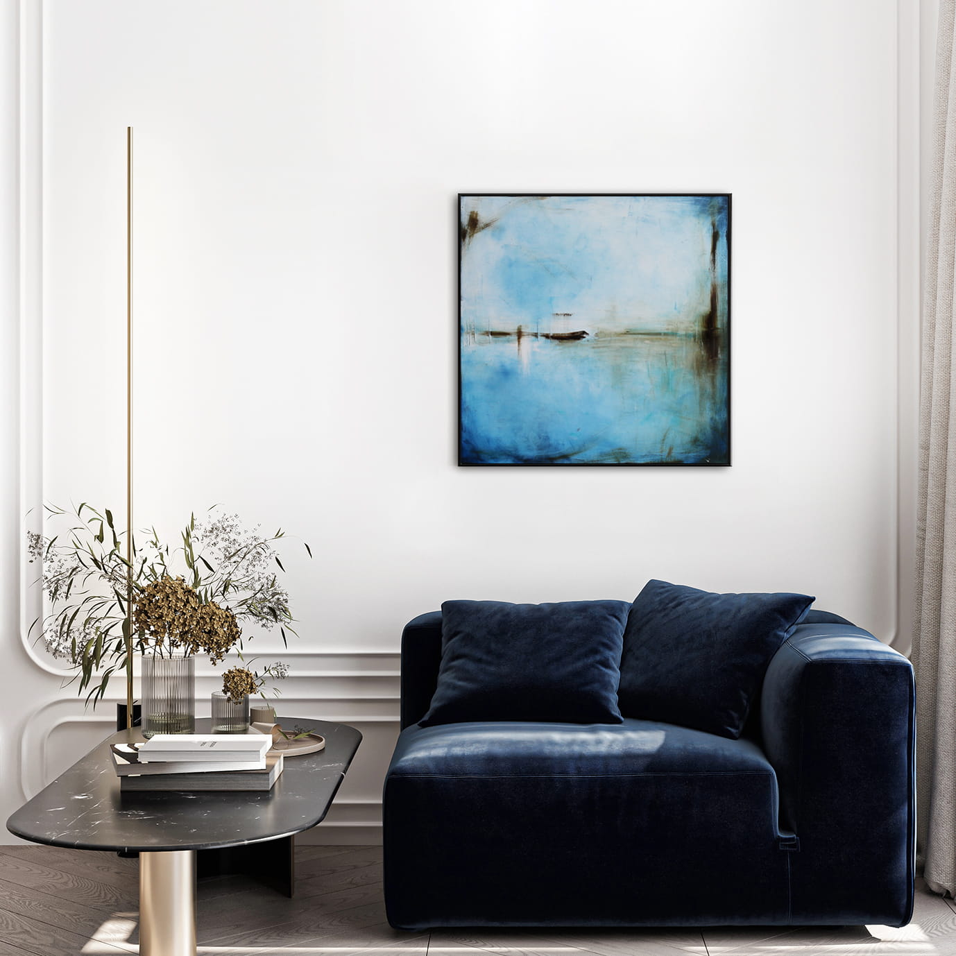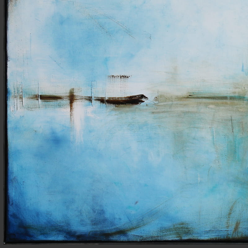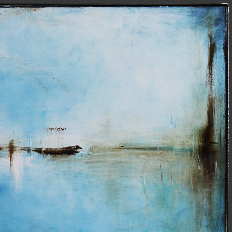 Obraz abstrakcyjny w delikatnej niebieskiej tonacji. Środek wyznacza łagodna linia brązu z turkusem. Subtelna kolorystyka i zredukowana kompozycja doskonale sprawdzi się w klimatycznej sypialni.