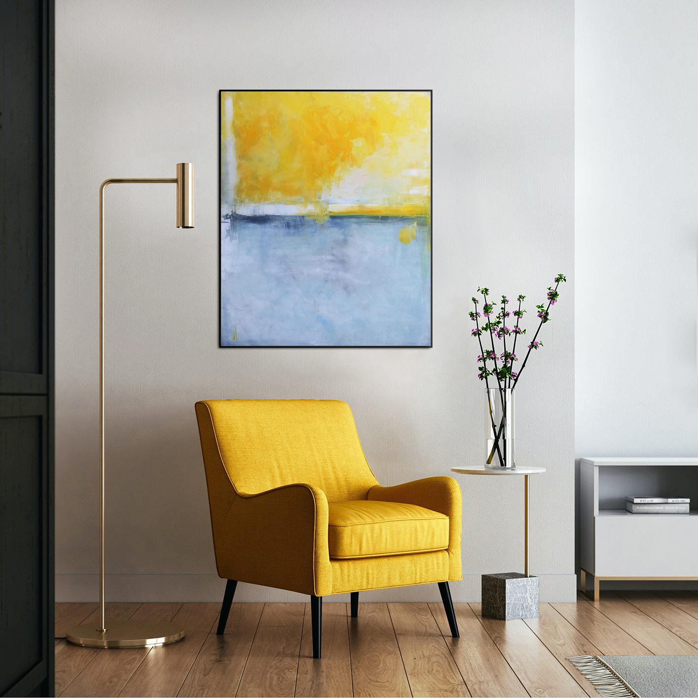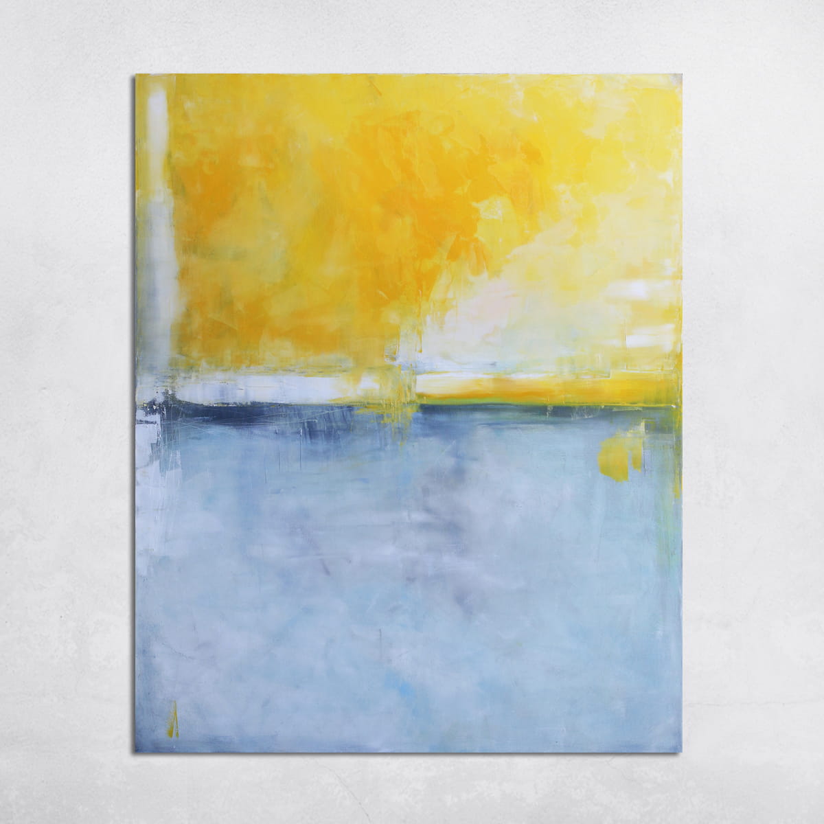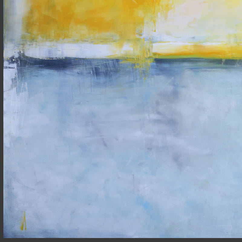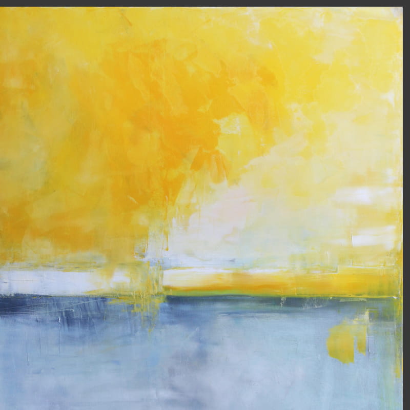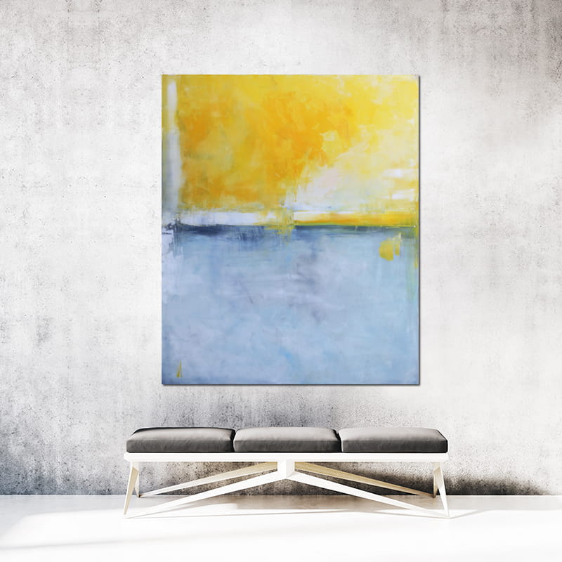 Nowoczesny obraz z dominującą gamą żółtego przechodzącego w złocisty i gołębi przenikający w kobalt. Kompozycja oparta na kontraście kolorystycznym. Obraz olejny odnajdzie się w salonie i sypialni wnosząc nienachalny koloryt do wnętrza.