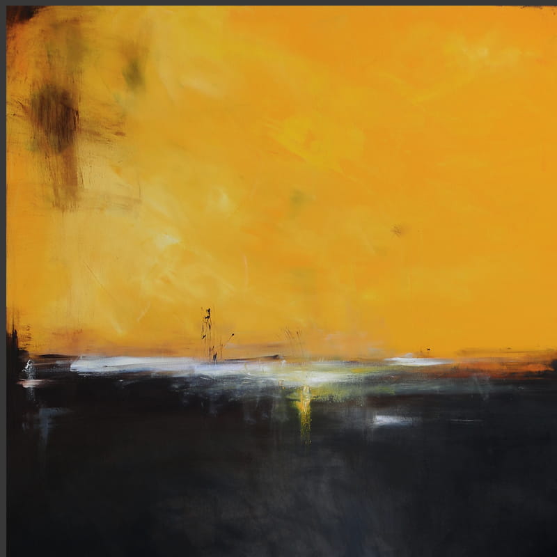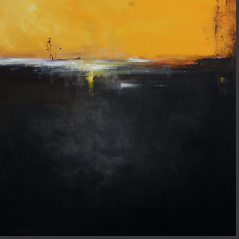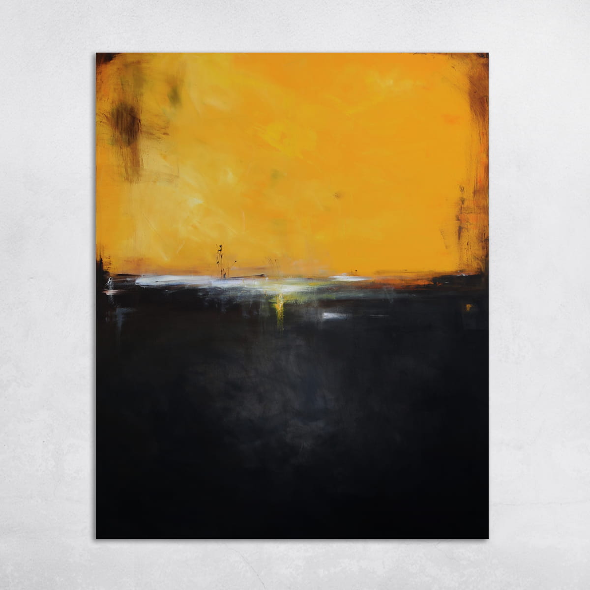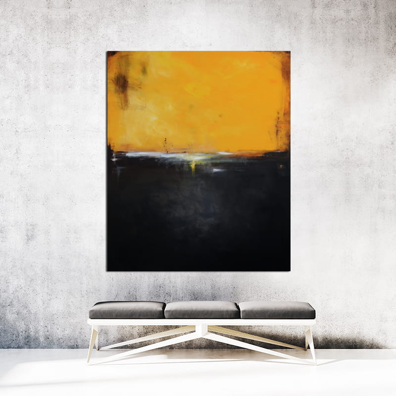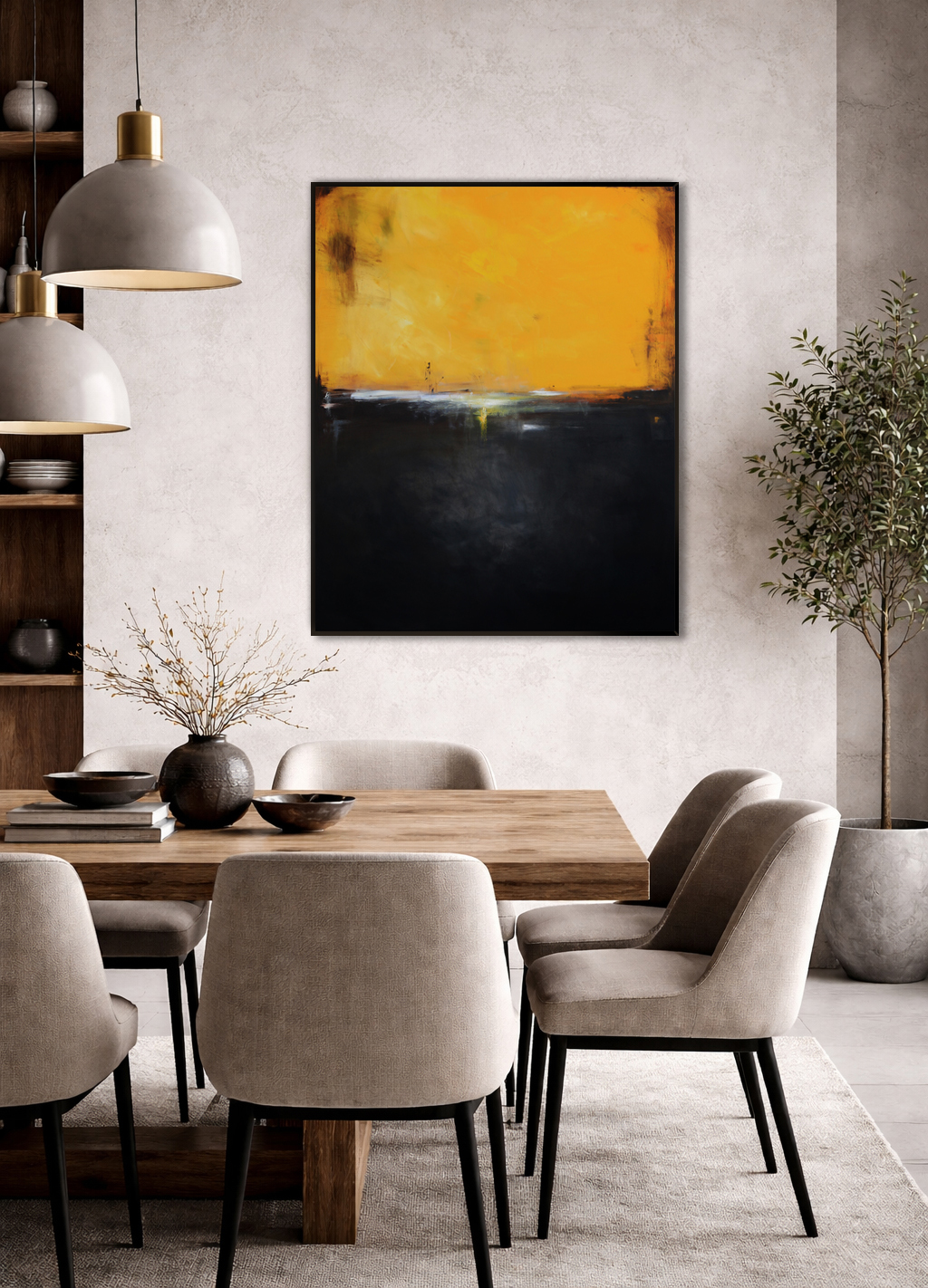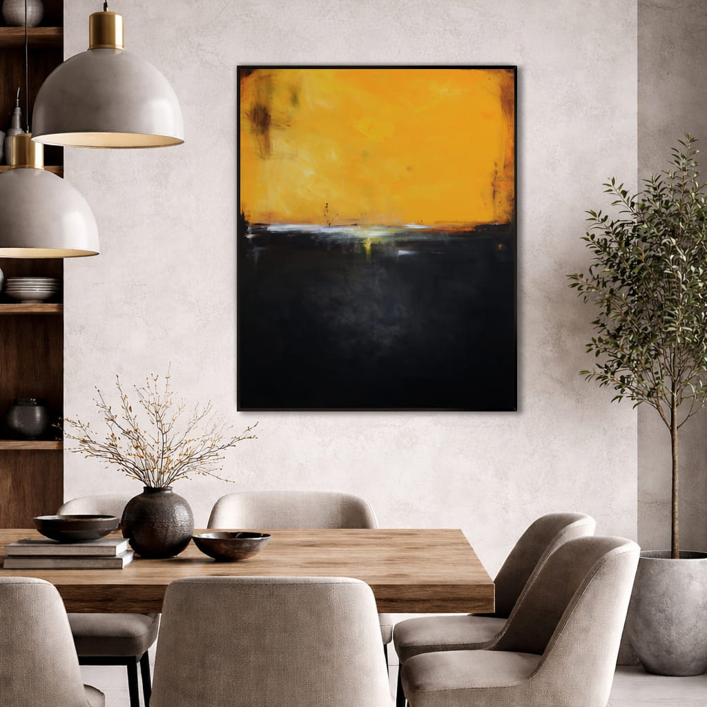 Nowoczesny obraz, w którym kompozycja oparta została na kontraście góry w kolorze szafranu i dołu w graficie. Wyrazisty obraz olejny na płótnie podkreśli przestrzeń salonu czy jadalni stanowiąc centralny punkt na ścianie.