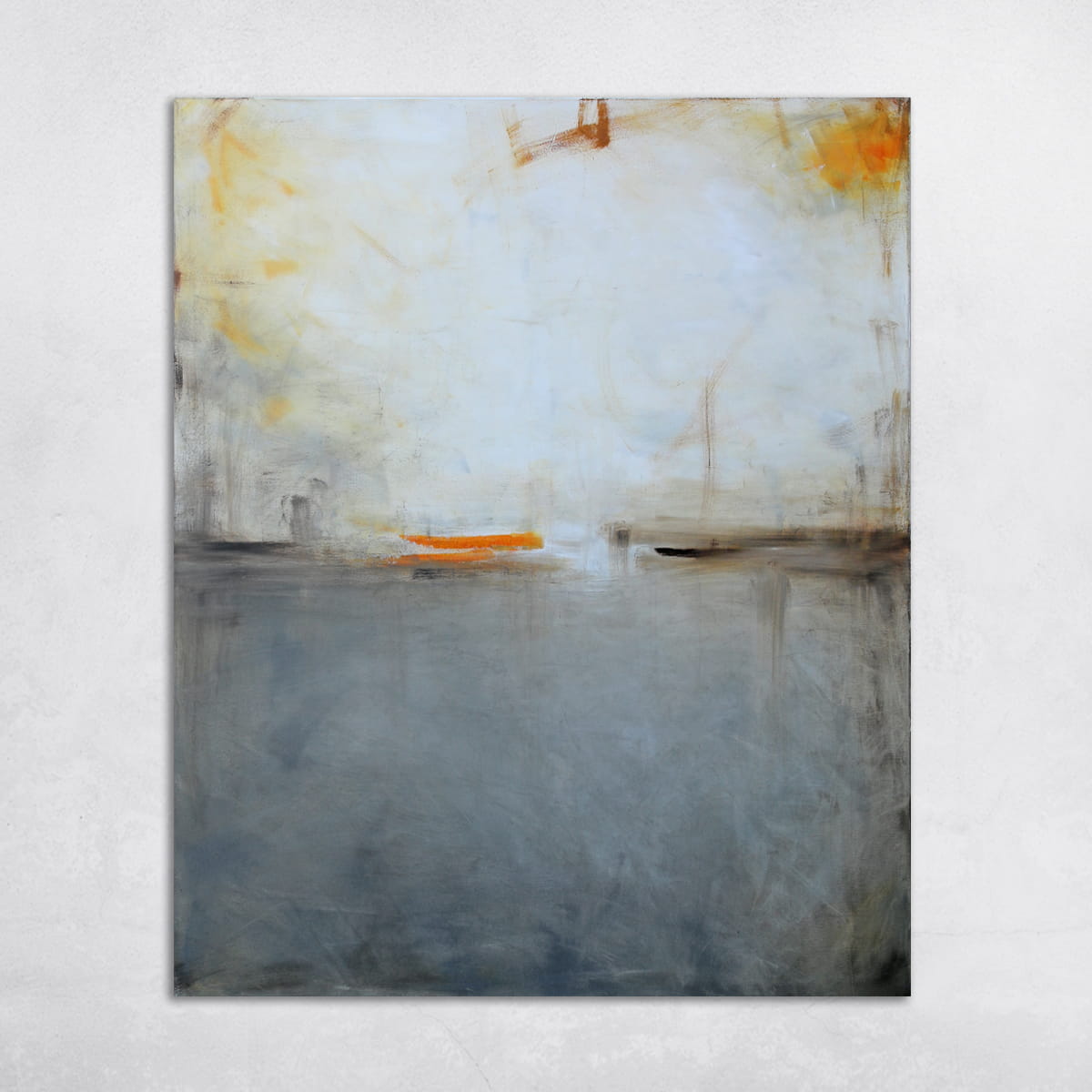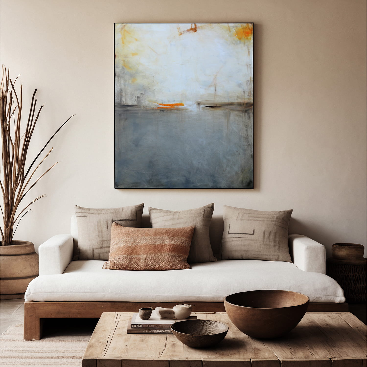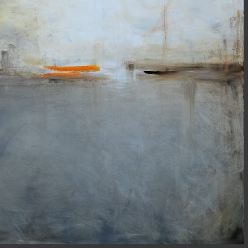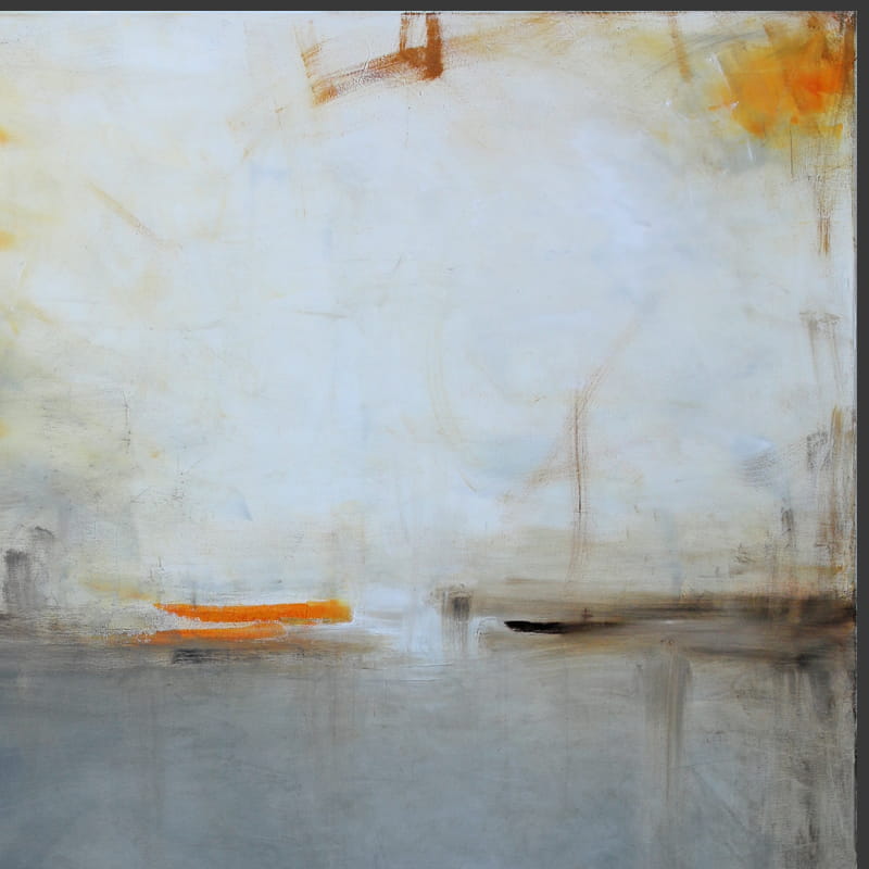 Minimalistyczny obraz, w którym dominuje biel, beż i szary. W centralną kompozycję obrazu wpisana została linia brązu z pomarańczowym, która momentami zanika innym razem wyłania się. Subtelny obraz olejny doskonale wpasuje się we wnętrze salonu, gabinetu czy sypialni.