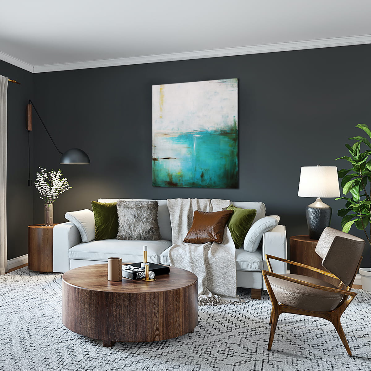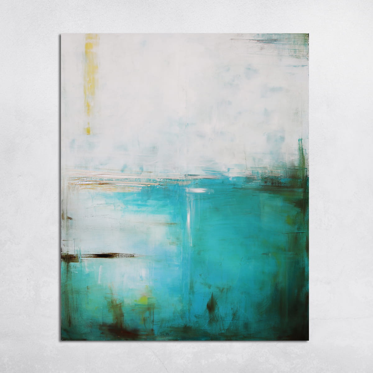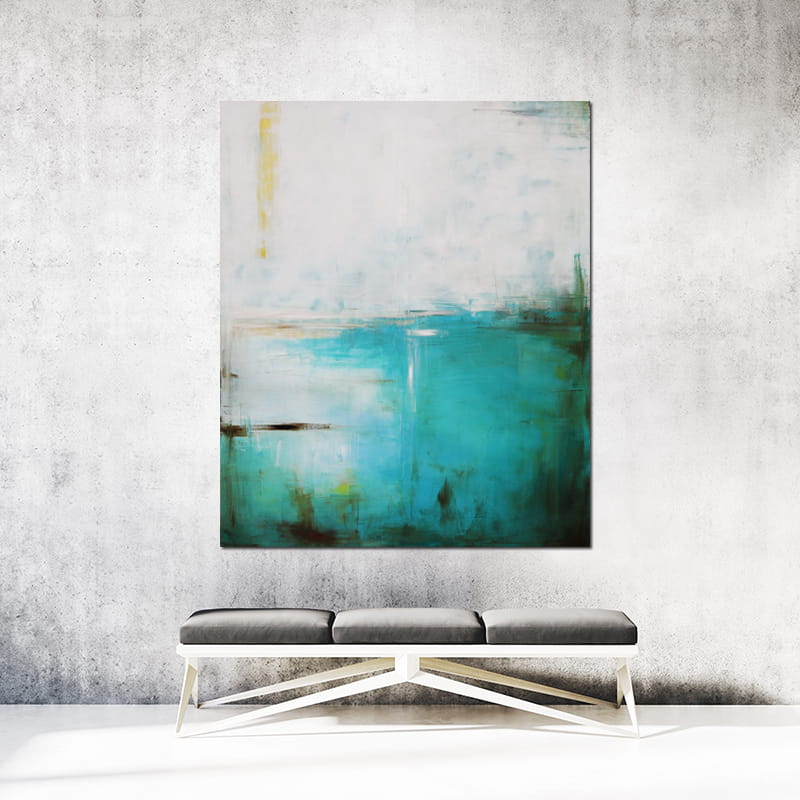 Abstrakcyjny obraz olejny z dominującą gamą głębokiej zieleni i turkusu z domieszką cytrynowego koloru. Taka kolorystyka rozjaśni i wprowadzi świeży koloryt do salonu, a także sypialni stanowiąc centralny punkt na ścianie. Obrazy stanowią nie tylko dekorację, są przede wszystkim odzwierciedleniem naszego stylu i atmosfery danego wnętrza.