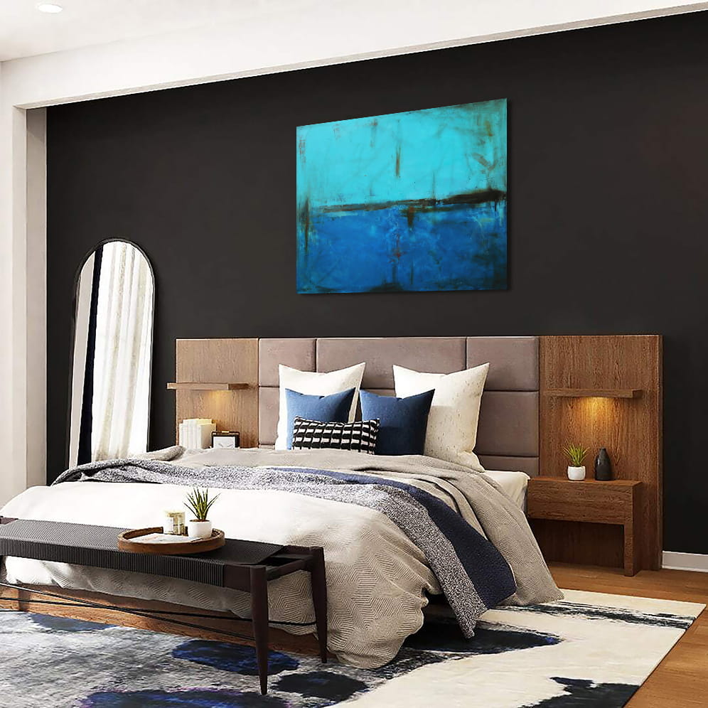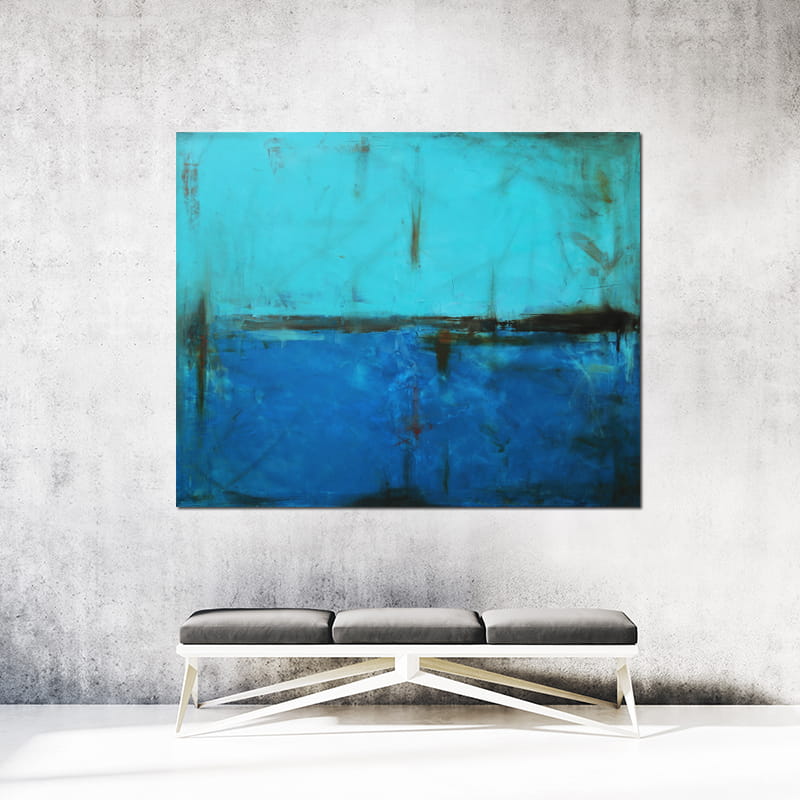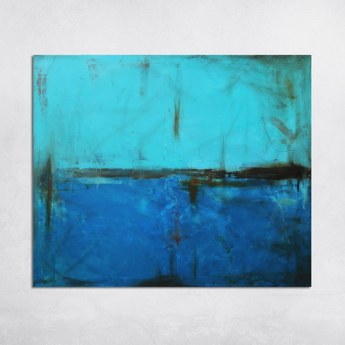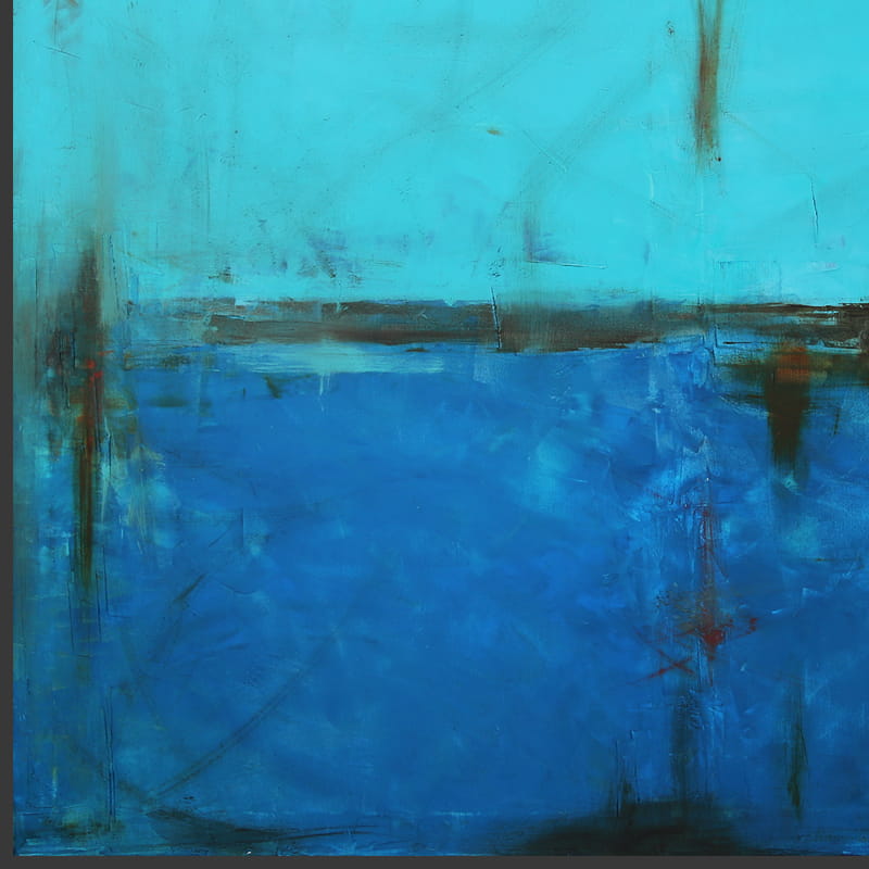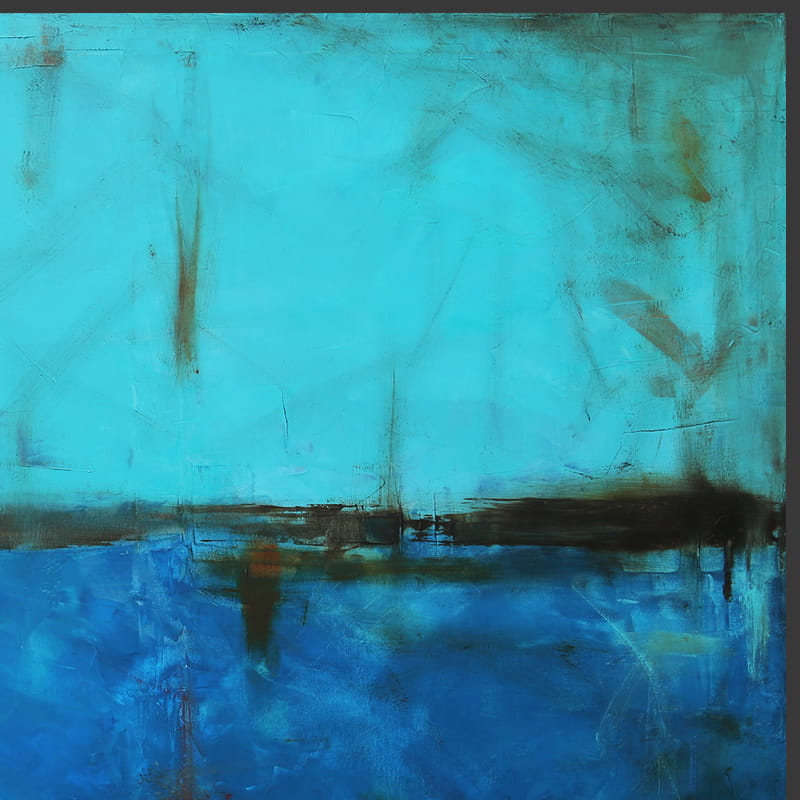 Nowoczesny obraz z dominującą gamą turkusu, głębokiego błękitnego z kroplą chabru i akcentami brązu. Na pierwszy rzut oka kojarzy się z abstrakcyjnym pejzażem. Jednakże jest to wysublimowana gra kolorów, płaszczyzn i linii niekiedy zanikających, innym razem stawiających granicę. Dzięki swojej intensywnej kolorystyce z pewnością przyciągnie uwagę i stanie się centralnym punktem każdego pomieszczenia.