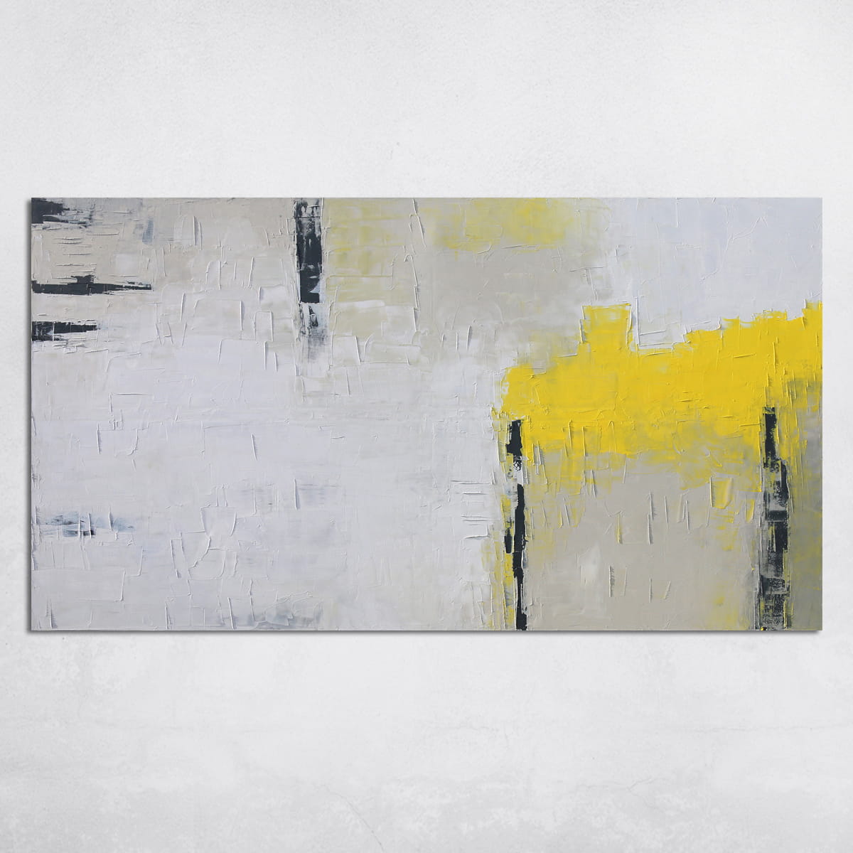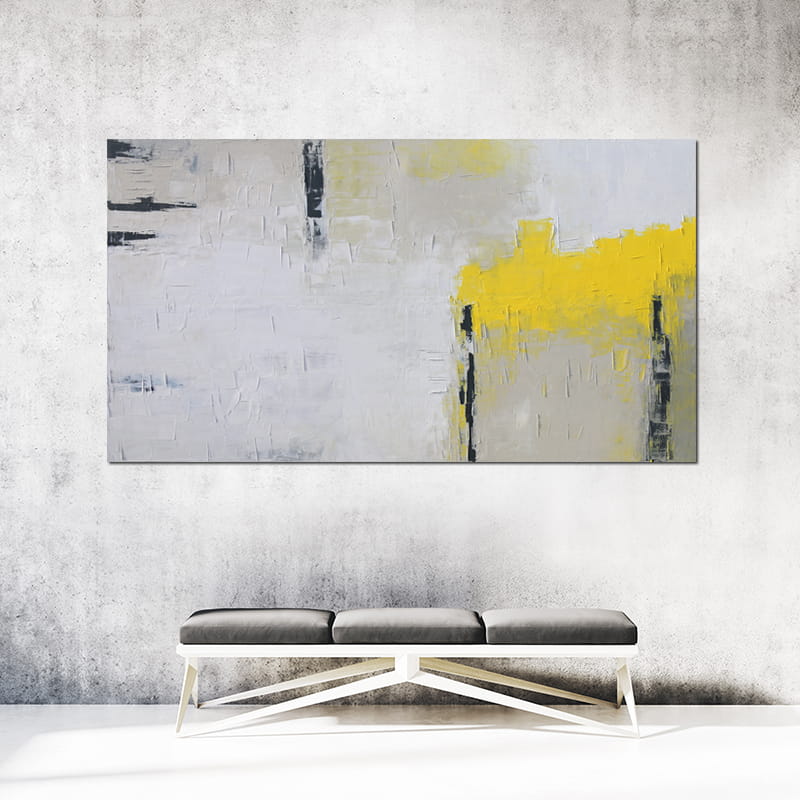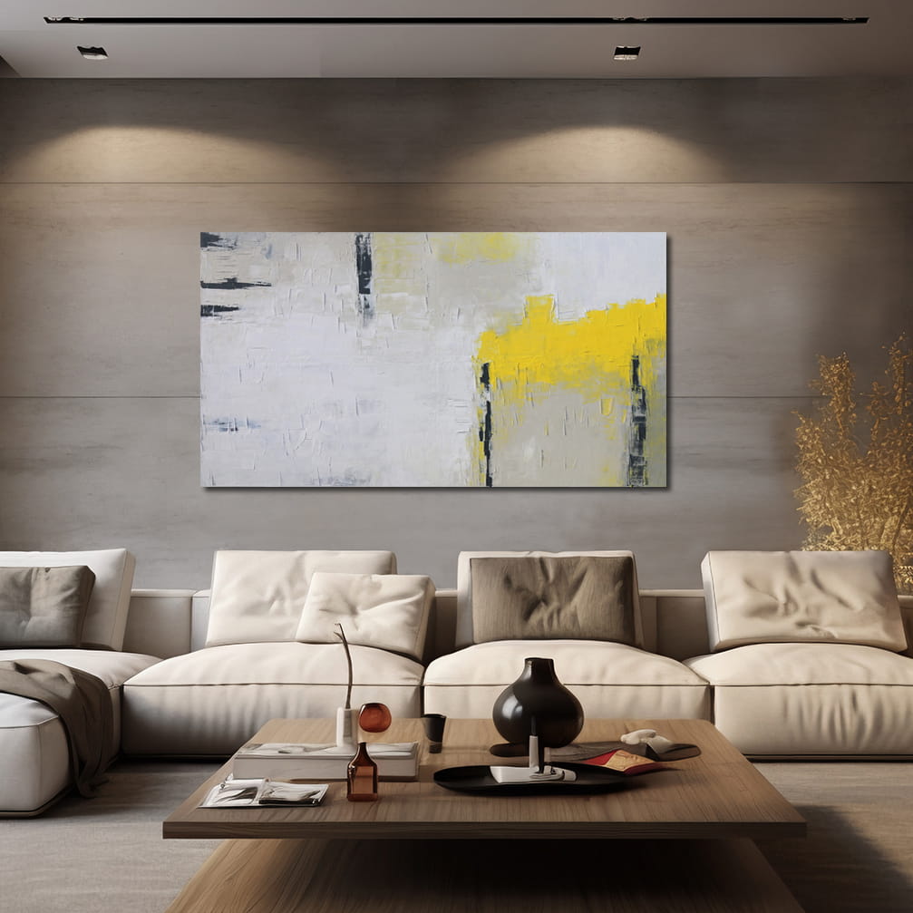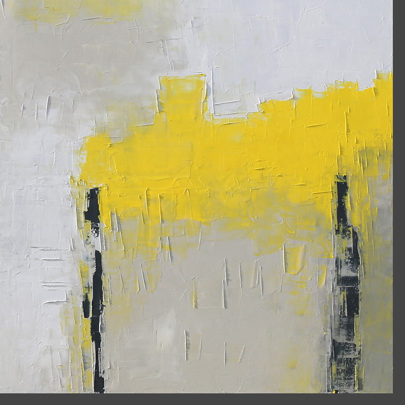 Wielkoformatowy obraz olejny, w którym dominuje biel, beż z żółtym oraz akcenty grafitowego. Obraz o harmonijnym, spokojnym nastroju, którego kompozycja pozwoli na wpasowanie się do salonu lub sypialni z dodatkami szarości czy elementami drewna.