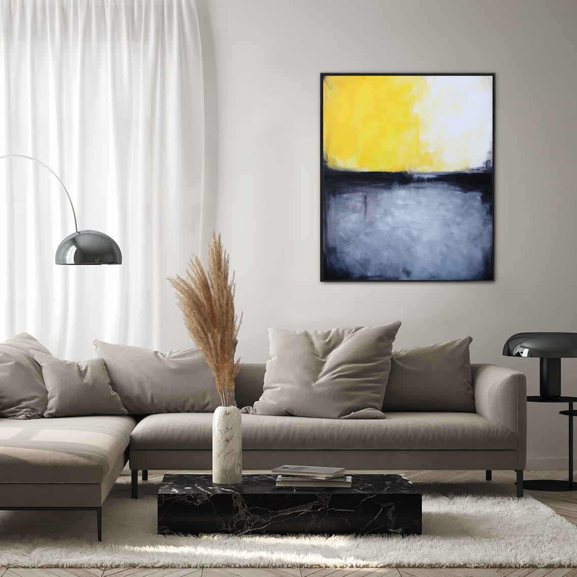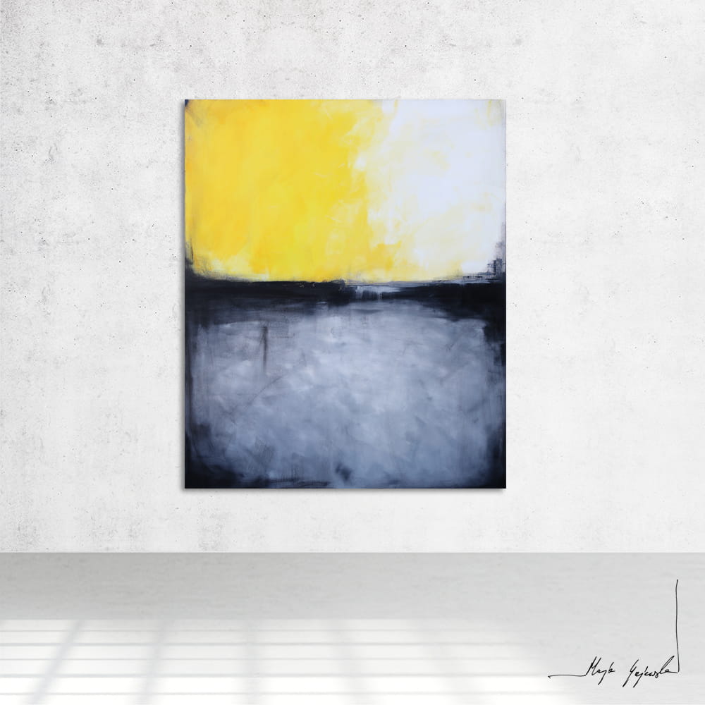 Nowoczesny obraz z kompozycją opartą na kontraście kolorystycznym. Delikatny cytrynowy kolor dopełnia grafitową część obrazu. Charakterystyczną cechą tego obrazu jest w centralnej części czarny akcent wykonany dynamicznymi pociągnięciami pędzla. Obraz olejny odnajdzie się w salonie i sypialni wnosząc nienachalny koloryt do wnętrza.