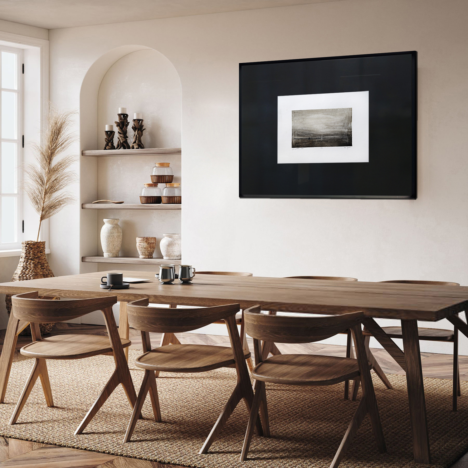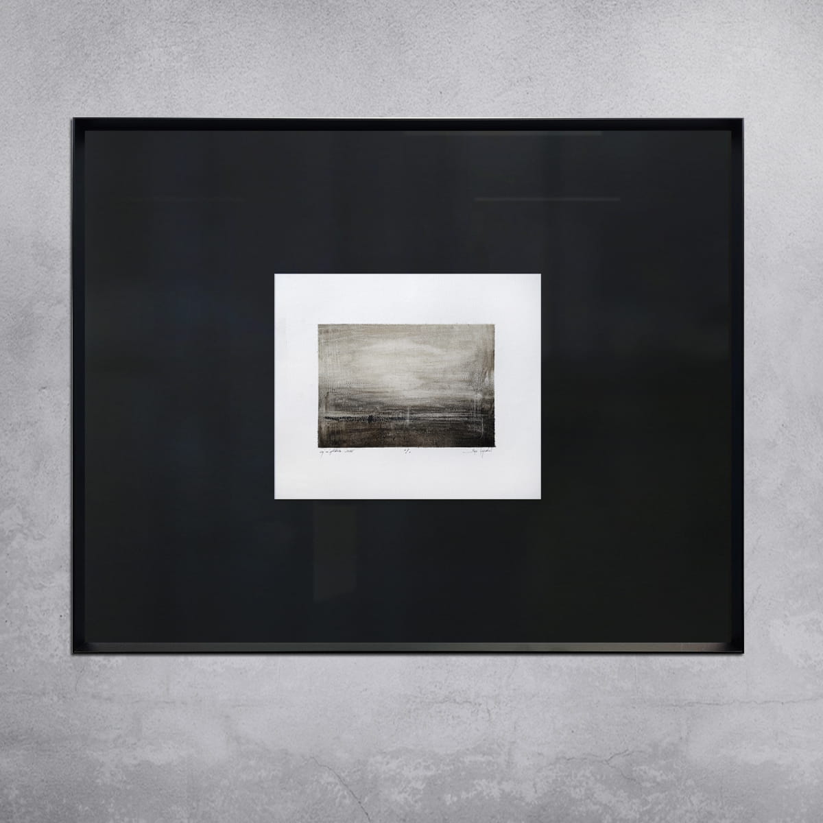 Obraz oprawiony w czarną, aluminiową ramę i antracytowe passe partout.